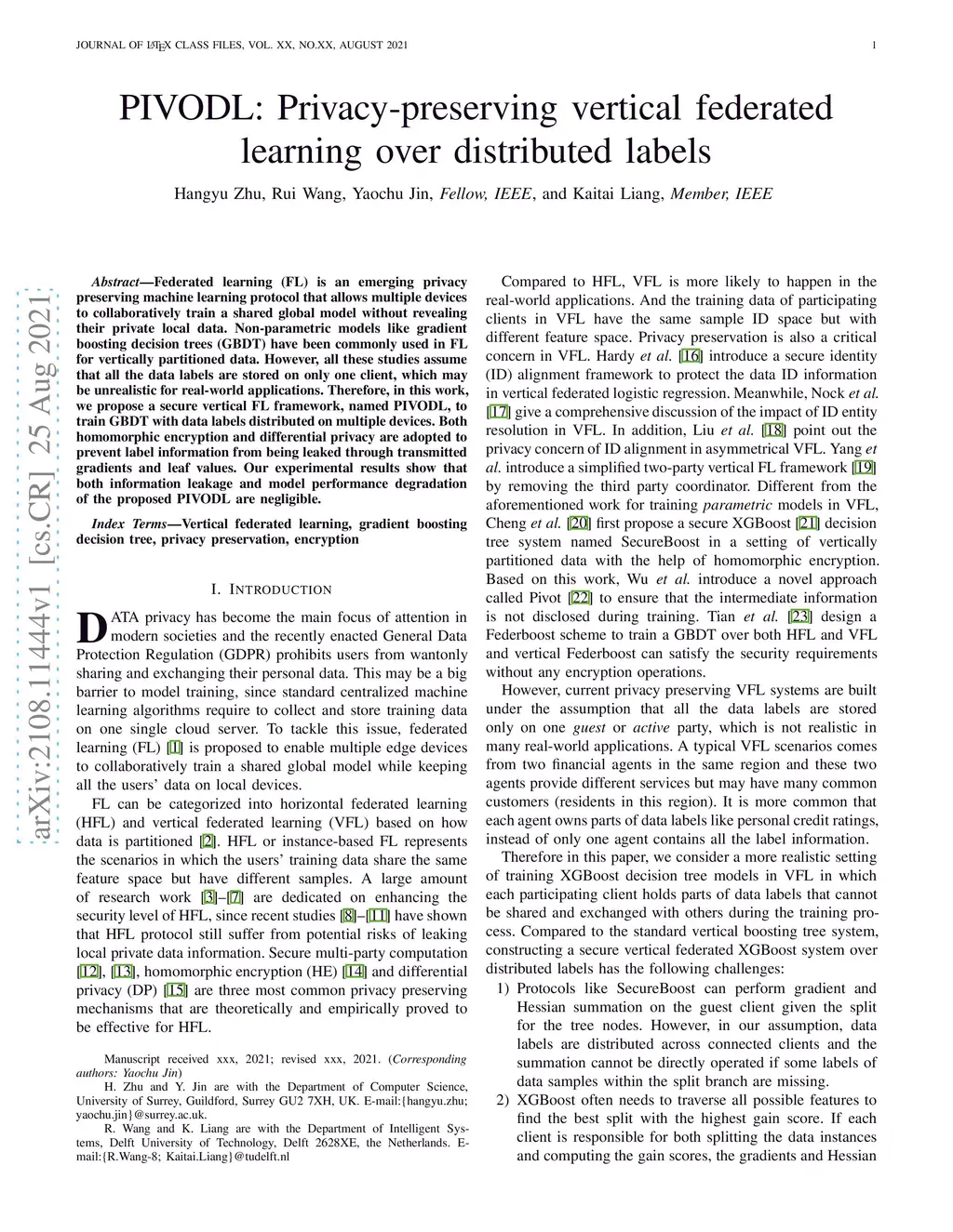 Federated learning (FL) is an emerging privacy preserving machine learning protocol that allows multiple devices to collaboratively train a shared global model without revealing their private local data. Non-parametric models like gradient boosting decision trees (GBDT) have been commonly used in FL for vertically partitioned data. However, all these studies assume that all the data labels are stored on only one client, which may be unrealistic for real-world applications. Therefore, in this work, we propose a secure vertical FL framework, named PIVODL, to train GBDT with data labels distributed on multiple devices. Both homomorphic encryption and differential privacy are adopted to prevent label information from being leaked through transmitted gradients and leaf values. Our experimental results show that both information leakage and model performance degradation of the proposed PIVODL are negligible.
