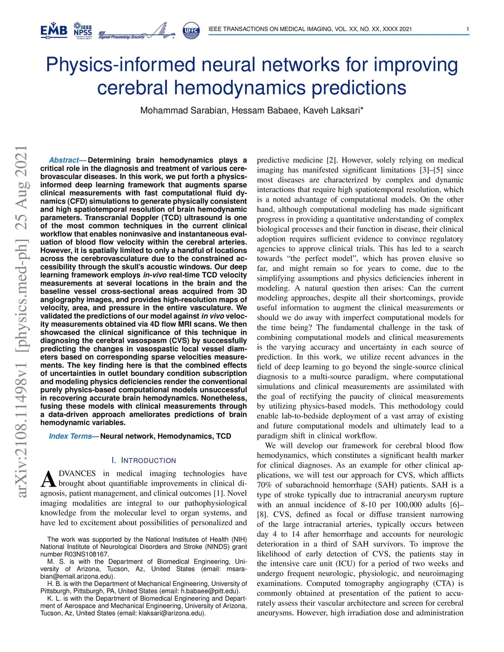 Determining brain hemodynamics plays a critical role in the diagnosis and treatment of various cerebrovascular diseases. In this work, we put forth a physics-informed deep learning framework that augments sparse clinical measurements with fast computational fluid dynamics (CFD) simulations to generate physically consistent and high spatiotemporal resolution of brain hemodynamic parameters. Transcranial Doppler (TCD) ultrasound is one of the most common techniques in the current clinical workflow that enables noninvasive and instantaneous evaluation of blood flow velocity within the cerebral arteries. However, it is spatially limited to only a handful of locations across the cerebrovasculature due to the constrained accessibility through the skull's acoustic windows. Our deep learning framework employs in-vivo real-time TCD velocity measurements at several locations in the brain and the baseline vessel cross-sectional areas acquired from 3D angiography images, and provides high-resolution maps of velocity, area, and pressure in the entire vasculature. We validated the predictions of our model against in-vivo velocity measurements obtained via 4D flow MRI scans. We then showcased the clinical significance of this technique in diagnosing the cerebral vasospasm (CVS) by successfully predicting the changes in vasospastic local vessel diameters based on corresponding sparse velocities measurements. The key finding here is that the combined effects of uncertainties in outlet boundary condition subscription and modeling physics deficiencies render the conventional purely physics-based computational models unsuccessful in recovering accurate brain hemodynamics. Nonetheless, fusing these models with clinical measurements through a data-driven approach ameliorates predictions of brain hemodynamic variables.