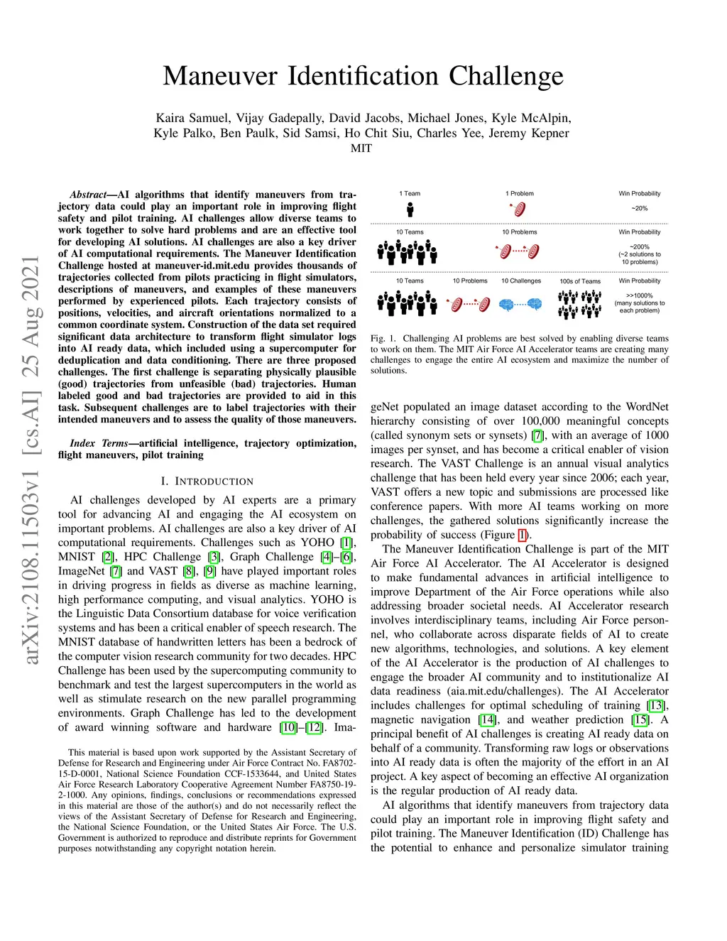 AI algorithms that identify maneuvers from trajectory data could play an important role in improving flight safety and pilot training. AI challenges allow diverse teams to work together to solve hard problems and are an effective tool for developing AI solutions. AI challenges are also a key driver of AI computational requirements. The Maneuver Identification Challenge hosted at maneuver-id.mit.edu provides thousands of trajectories collected from pilots practicing in flight simulators, descriptions of maneuvers, and examples of these maneuvers performed by experienced pilots. Each trajectory consists of positions, velocities, and aircraft orientations normalized to a common coordinate system. Construction of the data set required significant data architecture to transform flight simulator logs into AI ready data, which included using a supercomputer for deduplication and data conditioning. There are three proposed challenges. The first challenge is separating physically plausible (good) trajectories from unfeasible (bad) trajectories. Human labeled good and bad trajectories are provided to aid in this task. Subsequent challenges are to label trajectories with their intended maneuvers and to assess the quality of those maneuvers.