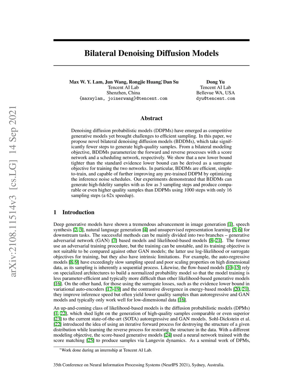 Denoising diffusion probabilistic models (DDPMs) have emerged as competitive generative models yet brought challenges to efficient sampling. In this paper, we propose novel bilateral denoising diffusion models (BDDMs), which take significantly fewer steps to generate high-quality samples. From a bilateral modeling objective, BDDMs parameterize the forward and reverse processes with a score network and a scheduling network, respectively. We show that a new lower bound tighter than the standard evidence lower bound can be derived as a surrogate objective for training the two networks. In particular, BDDMs are efficient, simple-to-train, and capable of further improving any pre-trained DDPM by optimizing the inference noise schedules. Our experiments demonstrated that BDDMs can generate high-fidelity samples with as few as 3 sampling steps and produce comparable or even higher quality samples than DDPMs using 1000 steps with only 16 sampling steps (a 62x speedup).