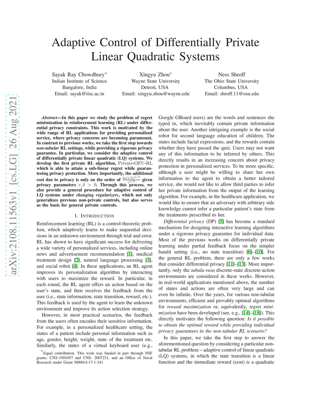 In this paper, we study the problem of regret minimization in reinforcement learning (RL) under differential privacy constraints. This work is motivated by the wide range of RL applications for providing personalized service, where privacy concerns are becoming paramount. In contrast to previous works, we take the first step towards non-tabular RL settings, while providing a rigorous privacy guarantee. In particular, we consider the adaptive control of differentially private linear quadratic (LQ) systems. We develop the first private RL algorithm, PRL, which is able to attain a sub-linear regret while guaranteeing privacy protection. More importantly, the additional cost due to privacy is only on the order of given privacy parameters . Through this process, we also provide a general procedure for adaptive control of LQ systems under changing regularizers, which not only generalizes previous non-private controls, but also serves as the basis for general private controls.