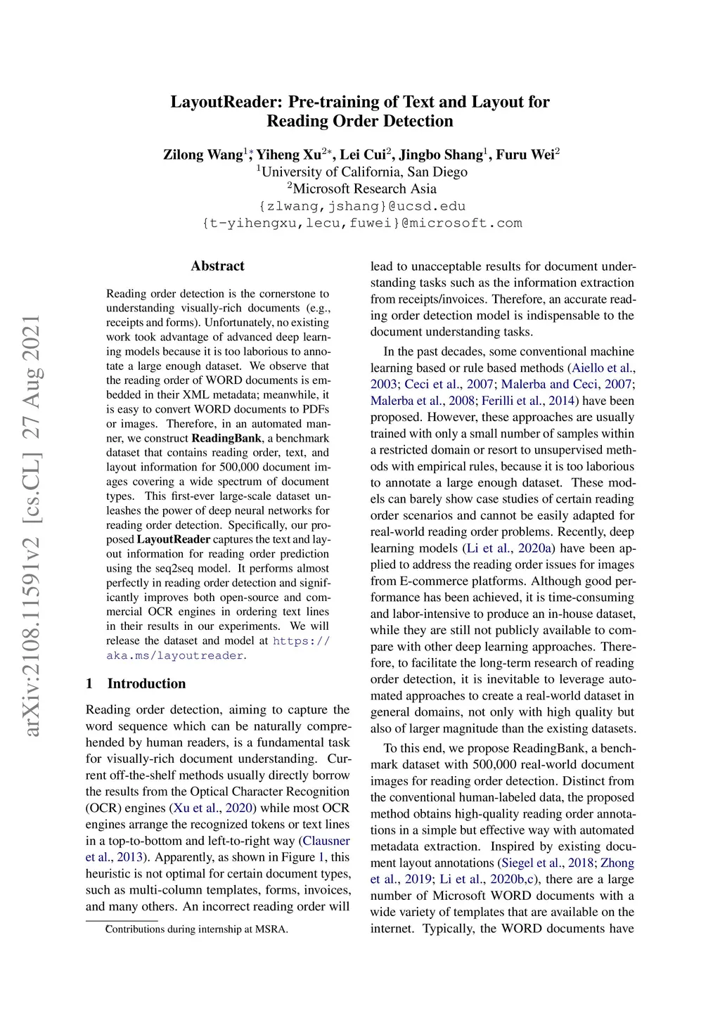 Reading order detection is the cornerstone to understanding visually-rich documents (e.g., receipts and forms). Unfortunately, no existing work took advantage of advanced deep learning models because it is too laborious to annotate a large enough dataset. We observe that the reading order of WORD documents is embedded in their XML metadata; meanwhile, it is easy to convert WORD documents to PDFs or images. Therefore, in an automated manner, we construct ReadingBank, a benchmark dataset that contains reading order, text, and layout information for 500,000 document images covering a wide spectrum of document types. This first-ever large-scale dataset unleashes the power of deep neural networks for reading order detection. Specifically, our proposed LayoutReader captures the text and layout information for reading order prediction using the seq2seq model. It performs almost perfectly in reading order detection and significantly improves both open-source and commercial OCR engines in ordering text lines in their results in our experiments. We will release the dataset and model at \url{https://aka.ms/layoutreader}.