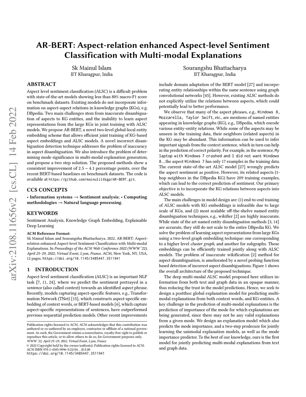 Aspect level sentiment classification (ALSC) is a difficult problem with state-of-the-art models showing less than 80% macro-F1 score on benchmark datasets. Existing models do not incorporate information on aspect-aspect relations in knowledge graphs (KGs), e.g. DBpedia. Two main challenges stem from inaccurate disambiguation of aspects to KG entities, and the inability to learn aspect representations from the large KGs in joint training with ALSC models. We propose AR-BERT, a novel two-level global-local entity embedding scheme that allows efficient joint training of KG-based aspect embeddings and ALSC models. A novel incorrect disambiguation detection technique addresses the problem of inaccuracy in aspect disambiguation. We also introduce the problem of determining mode significance in multi-modal explanation generation, and propose a two step solution. The proposed methods show a consistent improvement of 2.5 - 4.1 percentage points, over the recent BERT-based baselines on benchmark datasets. The code is available at https://github.com/mainuliitkgp/AR-BERT.git.