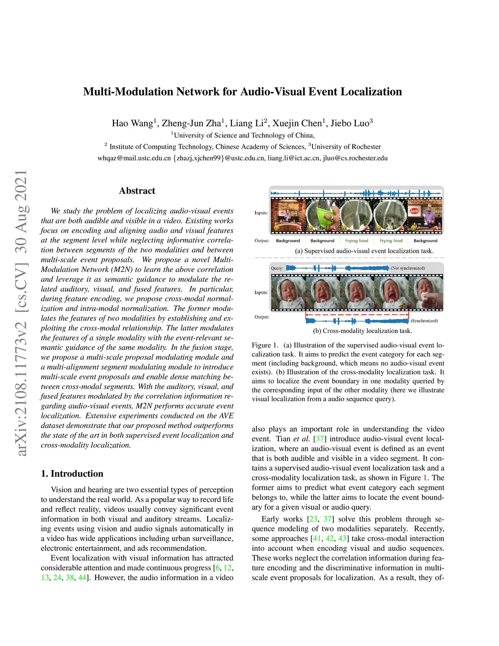 We study the problem of localizing audio-visual events that are both audible and visible in a video. Existing works focus on encoding and aligning audio and visual features at the segment level while neglecting informative correlation between segments of the two modalities and between multi-scale event proposals. We propose a novel MultiModulation Network (M2N) to learn the above correlation and leverage it as semantic guidance to modulate the related auditory, visual, and fused features. In particular, during feature encoding, we propose cross-modal normalization and intra-modal normalization. The former modulates the features of two modalities by establishing and exploiting the cross-modal relationship. The latter modulates the features of a single modality with the event-relevant semantic guidance of the same modality. In the fusion stage,we propose a multi-scale proposal modulating module and a multi-alignment segment modulating module to introduce multi-scale event proposals and enable dense matching between cross-modal segments. With the auditory, visual, and fused features modulated by the correlation information regarding audio-visual events, M2N performs accurate event localization. Extensive experiments conducted on the AVE dataset demonstrate that our proposed method outperforms the state of the art in both supervised event localization and cross-modality localization.