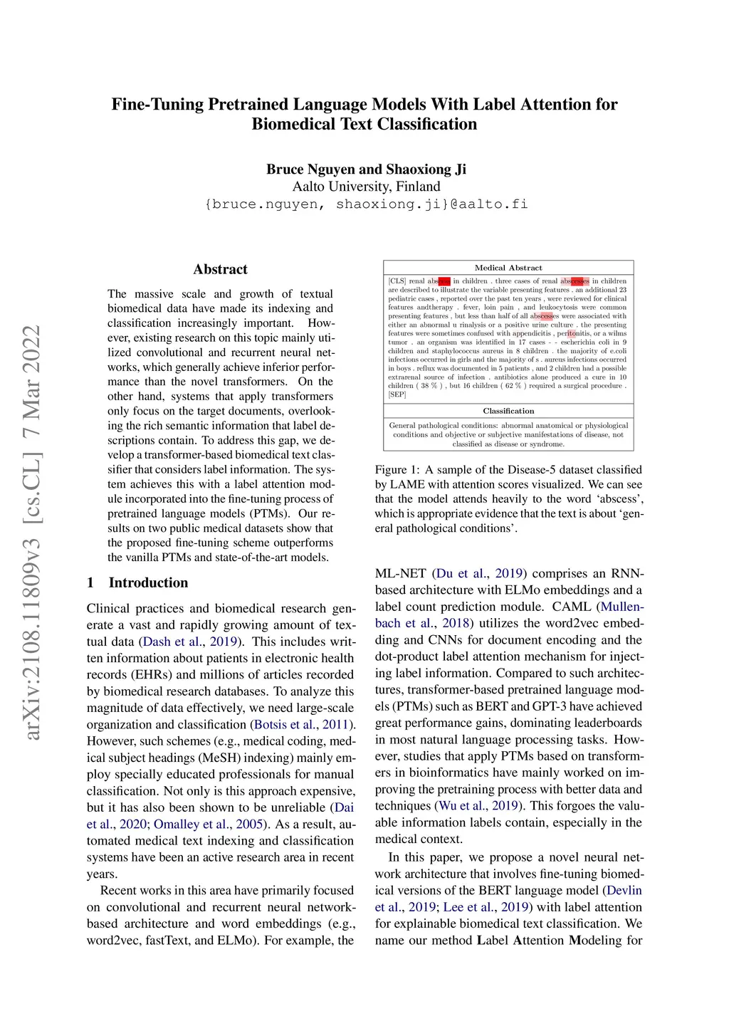 The massive scale and growth of textual biomedical data have made its indexing and classification increasingly important. However, existing research on this topic mainly utilized convolutional and recurrent neural networks, which generally achieve inferior performance than the novel transformers. On the other hand, systems that apply transformers only focus on the target documents, overlooking the rich semantic information that label descriptions contain. To address this gap, we develop a transformer-based biomedical text classifier that considers label information. The system achieves this with a label attention module incorporated into the fine-tuning process of pretrained language models (PTMs). Our results on two public medical datasets show that the proposed fine-tuning scheme outperforms the vanilla PTMs and state-of-the-art models.
