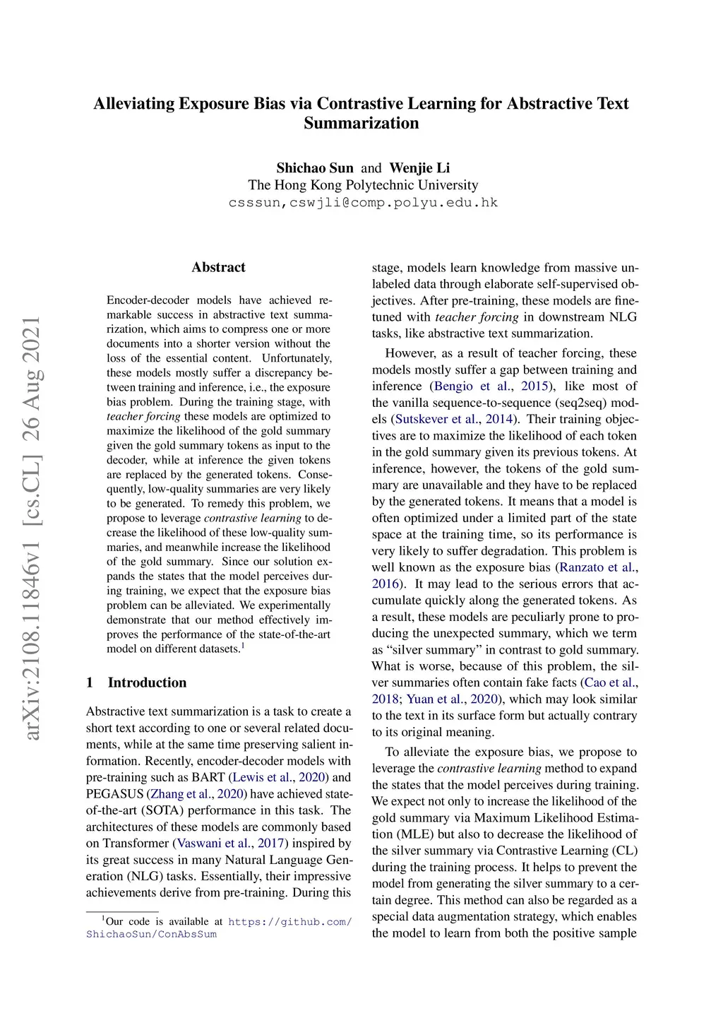 Alleviating Exposure Bias via Contrastive Learning for Abstractive Text