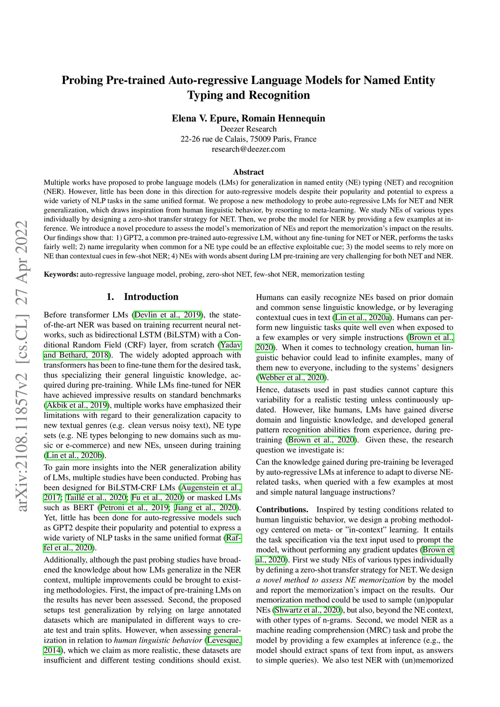Despite impressive results of language models for named entity recognition (NER), their generalization to varied textual genres, a growing entity type set, and new entities remains a challenge. Collecting thousands of annotations in each new case for training or fine-tuning is expensive and time-consuming. In contrast, humans can easily identify named entities given some simple instructions. Inspired by this, we challenge the reliance on large datasets and study pre-trained language models for NER in a meta-learning setup. First, we test named entity typing (NET) in a zero-shot transfer scenario. Then, we perform NER by giving few examples at inference. We propose a method to select seen and rare / unseen names when having access only to the pre-trained model and report results on these groups. The results show: auto-regressive language models as meta-learners can perform NET and NER fairly well especially for regular or seen names; name irregularity when often present for a certain entity type can become an effective exploitable cue; names with words foreign to the model have the most negative impact on results; the model seems to rely more on name than context cues in few-shot NER.