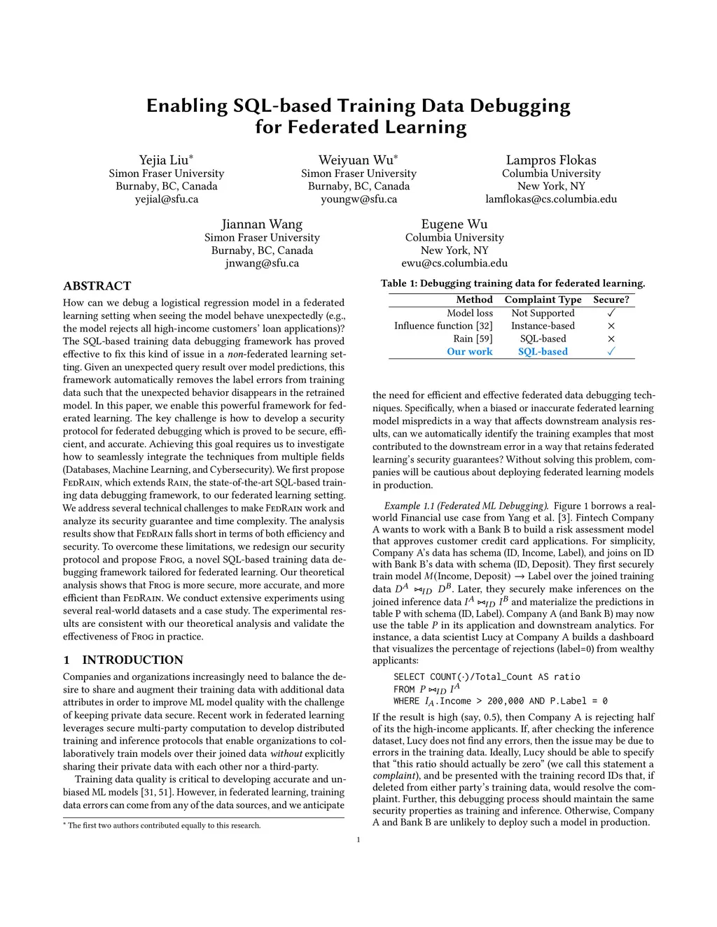How can we debug a logistical regression model in a federated learning setting when seeing the model behave unexpectedly (e.g., the model rejects all high-income customers' loan applications)? The SQL-based training data debugging framework has proved effective to fix this kind of issue in a non-federated learning setting. Given an unexpected query result over model predictions, this framework automatically removes the label errors from training data such that the unexpected behavior disappears in the retrained model. In this paper, we enable this powerful framework for federated learning. The key challenge is how to develop a security protocol for federated debugging which is proved to be secure, efficient, and accurate. Achieving this goal requires us to investigate how to seamlessly integrate the techniques from multiple fields (Databases, Machine Learning, and Cybersecurity). We first propose FedRain, which extends Rain, the state-of-the-art SQL-based training data debugging framework, to our federated learning setting. We address several technical challenges to make FedRain work and analyze its security guarantee and time complexity. The analysis results show that FedRain falls short in terms of both efficiency and security. To overcome these limitations, we redesign our security protocol and propose Frog, a novel SQL-based training data debugging framework tailored for federated learning. Our theoretical analysis shows that Frog is more secure, more accurate, and more efficient than FedRain. We conduct extensive experiments using several real-world datasets and a case study. The experimental results are consistent with our theoretical analysis and validate the effectiveness of Frog in practice.
