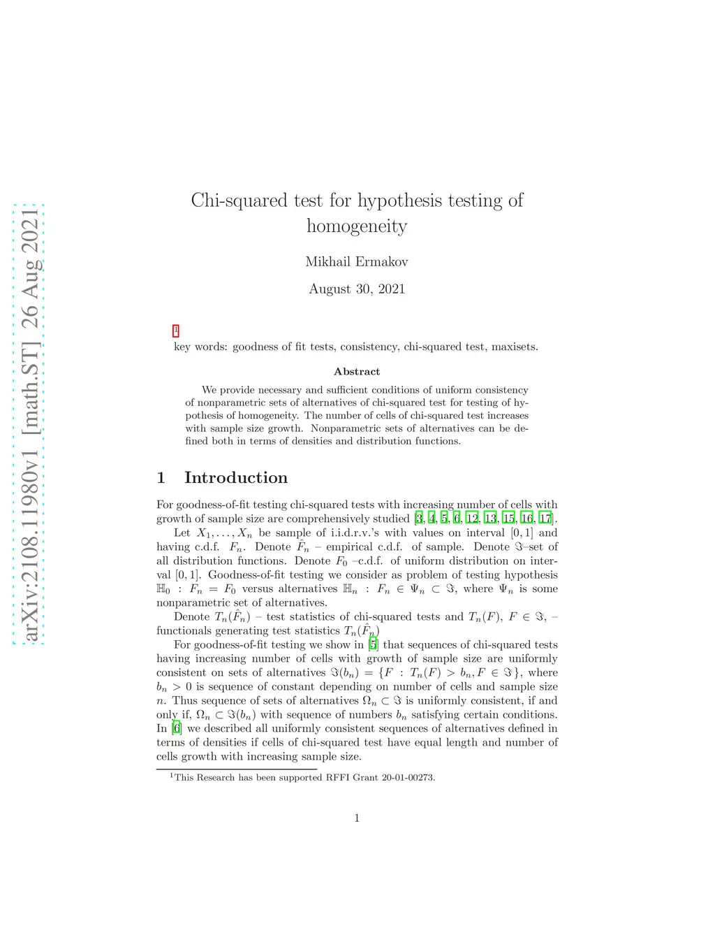We provide necessary and sufficient conditions of uniform consistency of nonparametric sets of alternatives of chi-squared test for testing of hypothesis of homogeneity. The number of cells of chi-squared test increases with sample size growth. Nonparametric sets of alternatives can be defined both in terms of densities and distribution functions.