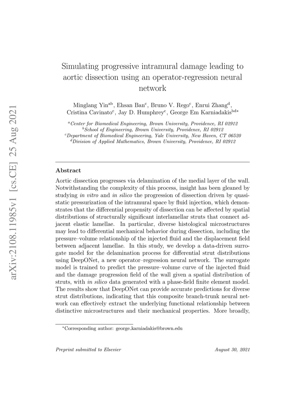 Aortic dissection progresses via delamination of the medial layer of the wall. Notwithstanding the complexity of this process, insight has been gleaned by studying in vitro and in silico the progression of dissection driven by quasi-static pressurization of the intramural space by fluid injection, which demonstrates that the differential propensity of dissection can be affected by spatial distributions of structurally significant interlamellar struts that connect adjacent elastic lamellae. In particular, diverse histological microstructures may lead to differential mechanical behavior during dissection, including the pressure--volume relationship of the injected fluid and the displacement field between adjacent lamellae. In this study, we develop a data-driven surrogate model for the delamination process for differential strut distributions using DeepONet, a new operator--regression neural network. The surrogate model is trained to predict the pressure--volume curve of the injected fluid and the damage progression field of the wall given a spatial distribution of struts, with in silico data generated with a phase-field finite element model. The results show that DeepONet can provide accurate predictions for diverse strut distributions, indicating that this composite branch-trunk neural network can effectively extract the underlying functional relationship between distinctive microstructures and their mechanical properties. More broadly, DeepONet can facilitate surrogate model-based analyses to quantify biological variability, improve inverse design, and predict mechanical properties based on multi-modality experimental data.