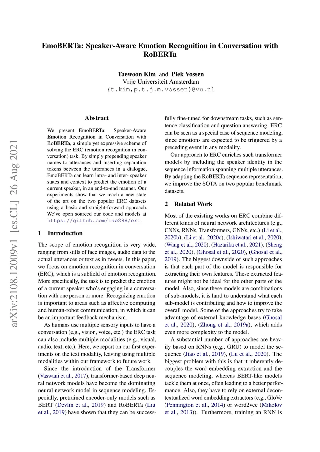 EmoBERTa: Speaker-Aware Emotion Recognition in Conversation with RoBERTa