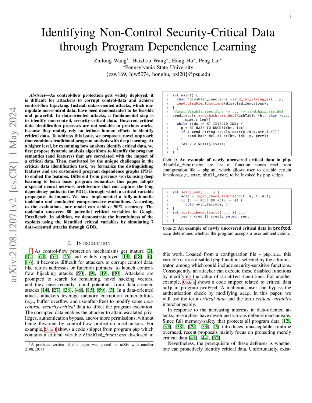 As control-flow protection gets widely deployed, it is difficult for attackers to corrupt control-data and achieve control-flow hijacking. Instead, data-oriented attacks, which manipulate non-control data, have been demonstrated to be feasible and powerful. In data-oriented attacks, a fundamental step is to identify non-control, security-critical data. However, critical data identification processes are not scalable in previous works, because they mainly rely on tedious human efforts to identify critical data. To address this issue, we propose a novel approach that combines traditional program analysis with deep learning. At a higher level, by examining how analysts identify critical data, we first propose dynamic analysis algorithms to identify the program semantics (and features) that are correlated with the impact of a critical data. Then, motivated by the unique challenges in the critical data identification task, we formalize the distinguishing features and use customized program dependence graphs (PDG) to embed the features. Different from previous works using deep learning to learn basic program semantics, this paper adopts a special neural network architecture that can capture the long dependency paths (in the PDG), through which a critical variable propagates its impact. We have implemented a fully-automatic toolchain and conducted comprehensive evaluations. According to the evaluations, our model can achieve 90% accuracy. The toolchain uncovers 80 potential critical variables in Google FuzzBench. In addition, we demonstrate the harmfulness of the exploits using the identified critical variables by simulating 7 data-oriented attacks through GDB.