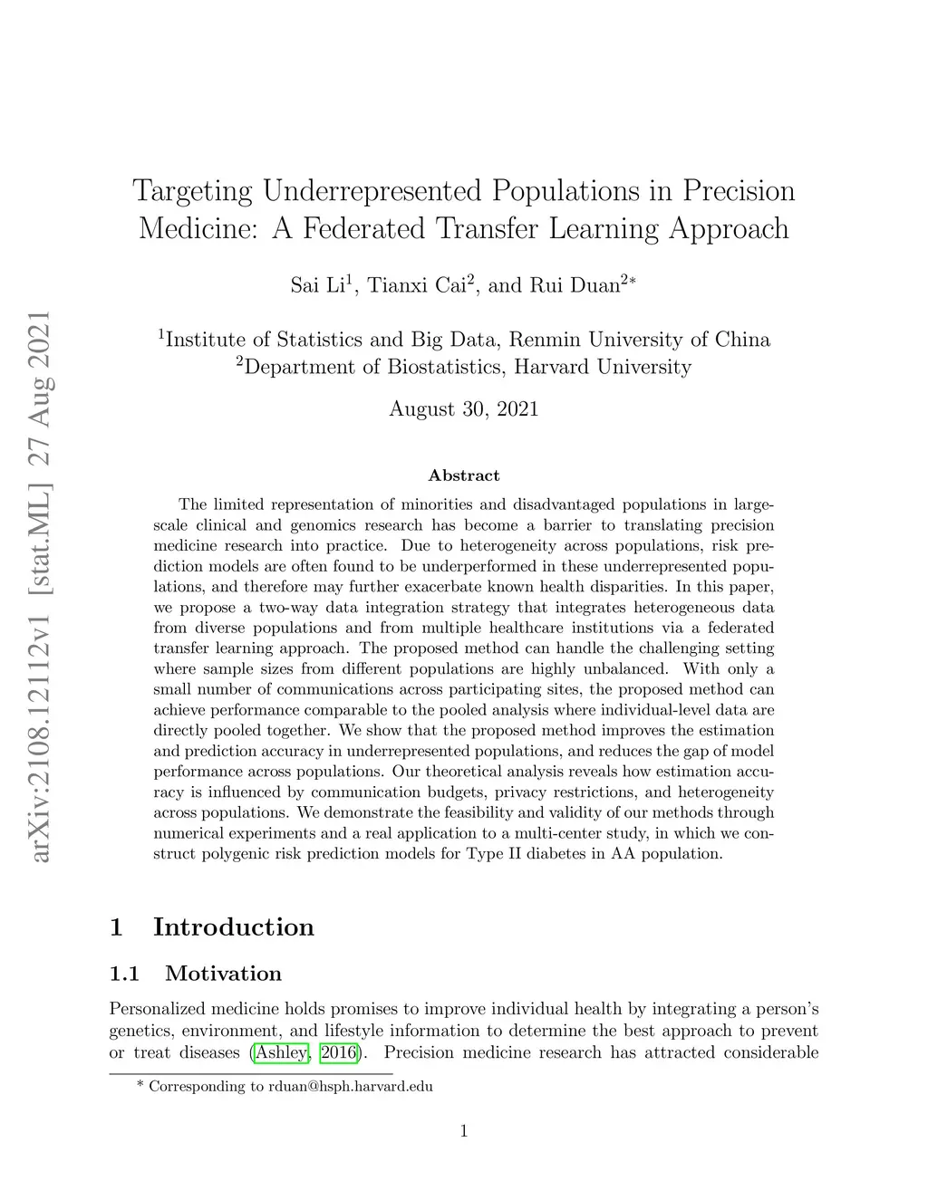The limited representation of minorities and disadvantaged populations in large-scale clinical and genomics research has become a barrier to translating precision medicine research into practice. Due to heterogeneity across populations, risk prediction models are often found to be underperformed in these underrepresented populations, and therefore may further exacerbate known health disparities. In this paper, we propose a two-way data integration strategy that integrates heterogeneous data from diverse populations and from multiple healthcare institutions via a federated transfer learning approach. The proposed method can handle the challenging setting where sample sizes from different populations are highly unbalanced. With only a small number of communications across participating sites, the proposed method can achieve performance comparable to the pooled analysis where individual-level data are directly pooled together. We show that the proposed method improves the estimation and prediction accuracy in underrepresented populations, and reduces the gap of model performance across populations. Our theoretical analysis reveals how estimation accuracy is influenced by communication budgets, privacy restrictions, and heterogeneity across populations. We demonstrate the feasibility and validity of our methods through numerical experiments and a real application to a multi-center study, in which we construct polygenic risk prediction models for Type II diabetes in AA population.