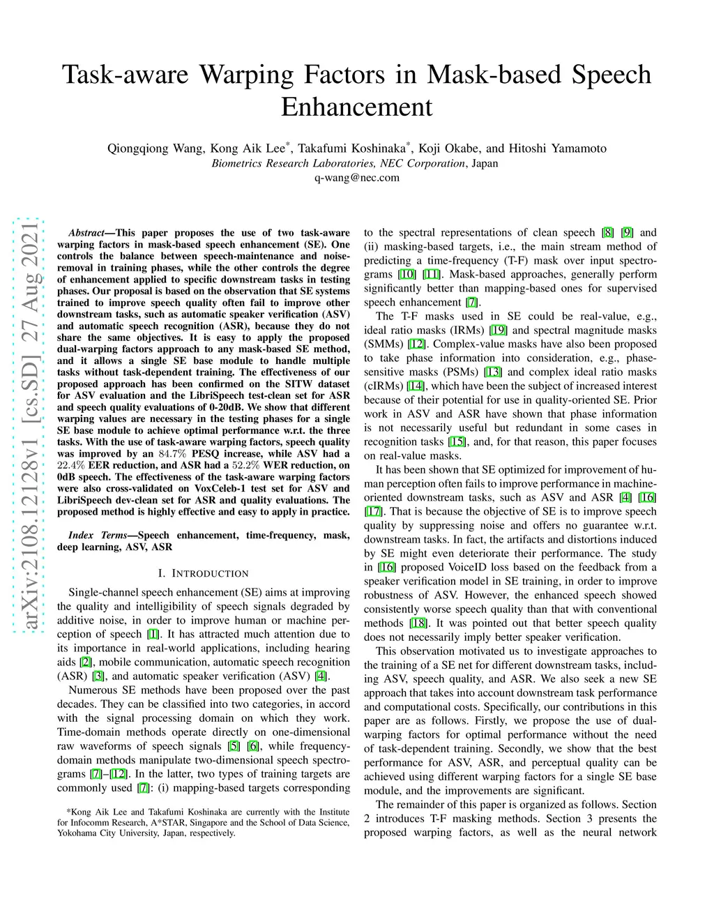 Task-aware Warping Factors in Mask-based Speech Enhancement
