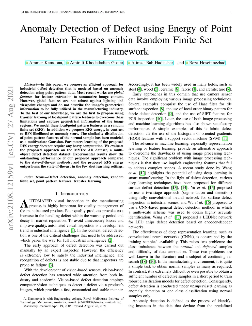 In this paper, we propose an efficient approach for industrial defect detection that is modeled based on anomaly detection using point pattern data. Most recent works use \textit{global features} for feature extraction to summarize image content. However, global features are not robust against lighting and viewpoint changes and do not describe the image's geometrical information to be fully utilized in the manufacturing industry. To the best of our knowledge, we are the first to propose using transfer learning of local/point pattern features to overcome these limitations and capture geometrical information of the image regions. We model these local/point pattern features as a random finite set (RFS). In addition we propose RFS energy, in contrast to RFS likelihood as anomaly score. The similarity distribution of point pattern features of the normal sample has been modeled as a multivariate Gaussian. Parameters learning of the proposed RFS energy does not require any heavy computation. We evaluate the proposed approach on the MVTec AD dataset, a multi-object defect detection dataset. Experimental results show the outstanding performance of our proposed approach compared to the state-of-the-art methods, and the proposed RFS energy outperforms the state-of-the-art in the few shot learning settings.