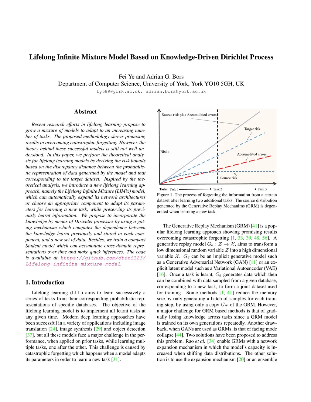 Recent research efforts in lifelong learning propose to grow a mixture of models to adapt to an increasing number of tasks. The proposed methodology shows promising results in overcoming catastrophic forgetting. However, the theory behind these successful models is still not well understood. In this paper, we perform the theoretical analysis for lifelong learning models by deriving the risk bounds based on the discrepancy distance between the probabilistic representation of data generated by the model and that corresponding to the target dataset. Inspired by the theoretical analysis, we introduce a new lifelong learning approach, namely the Lifelong Infinite Mixture (LIMix) model, which can automatically expand its network architectures or choose an appropriate component to adapt its parameters for learning a new task, while preserving its previously learnt information. We propose to incorporate the knowledge by means of Dirichlet processes by using a gating mechanism which computes the dependence between the knowledge learnt previously and stored in each component, and a new set of data. Besides, we train a compact Student model which can accumulate cross-domain representations over time and make quick inferences. The code is available at https://github.com/dtuzi123/Lifelong-infinite-mixture-model.