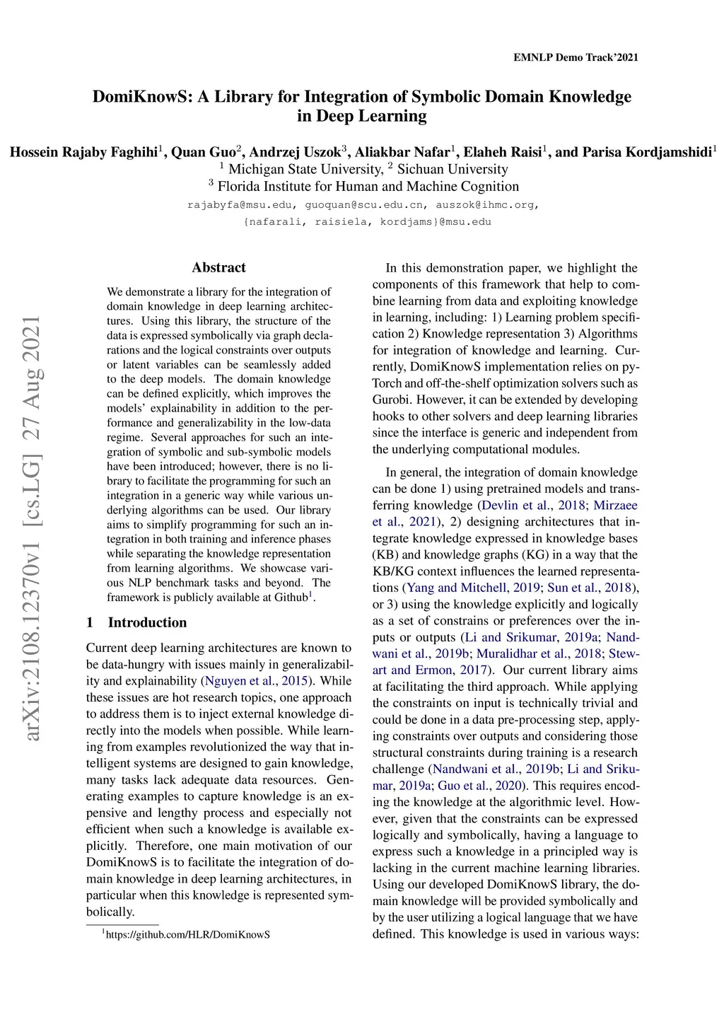 We demonstrate a library for the integration of domain knowledge in deep learning architectures. Using this library, the structure of the data is expressed symbolically via graph declarations and the logical constraints over outputs or latent variables can be seamlessly added to the deep models. The domain knowledge can be defined explicitly, which improves the models' explainability in addition to the performance and generalizability in the low-data regime. Several approaches for such an integration of symbolic and sub-symbolic models have been introduced; however, there is no library to facilitate the programming for such an integration in a generic way while various underlying algorithms can be used. Our library aims to simplify programming for such an integration in both training and inference phases while separating the knowledge representation from learning algorithms. We showcase various NLP benchmark tasks and beyond. The framework is publicly available at Github(https://github.com/HLR/DomiKnowS).