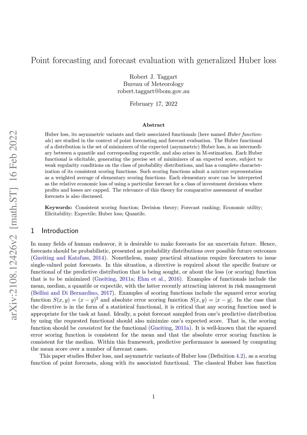 Huber loss, its asymmetric variants and their associated functionals (here named Huber functionals) are studied in the context of point forecasting and forecast evaluation. The Huber functional of a distribution is the set of minimizers of the expected (asymmetric) Huber loss, is an intermediary between a quantile and corresponding expectile, and also arises in M-estimation. Each Huber functional is elicitable, generating the precise set of minimizers of an expected score, subject to weak regularity conditions on the class of probability distributions, and has a complete characterization of its consistent scoring functions. Such scoring functions admit a mixture representation as a weighted average of elementary scoring functions. Each elementary score can be interpreted as the relative economic loss of using a particular forecast for a class of investment decisions where profits and losses are capped. The relevance of this theory for comparative assessment of weather forecasts is also discussed.