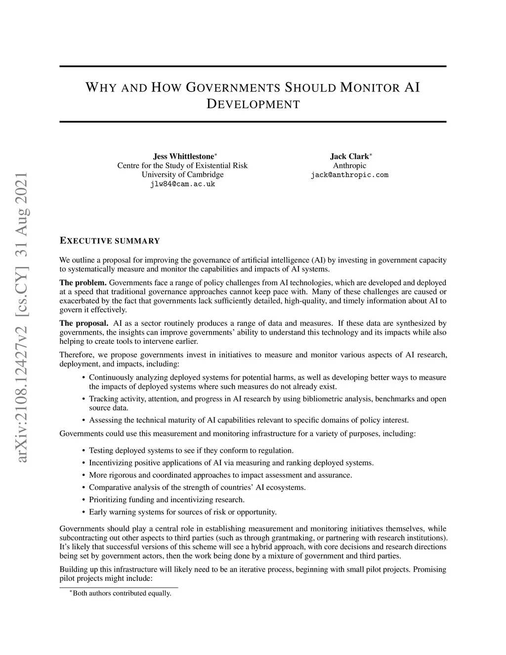 In this paper we outline a proposal for improving the governance of artificial intelligence (AI) by investing in government capacity to systematically measure and monitor the capabilities and impacts of AI systems. If adopted, this would give governments greater information about the AI ecosystem, equipping them to more effectively direct AI development and deployment in the most societally and economically beneficial directions. It would also create infrastructure that could rapidly identify potential threats or harms that could occur as a consequence of changes in the AI ecosystem, such as the emergence of strategically transformative capabilities, or the deployment of harmful systems. We begin by outlining the problem which motivates this proposal: in brief, traditional governance approaches struggle to keep pace with the speed of progress in AI. We then present our proposal for addressing this problem: governments must invest in measurement and monitoring infrastructure. We discuss this proposal in detail, outlining what specific things governments could focus on measuring and monitoring, and the kinds of benefits this would generate for policymaking. Finally, we outline some potential pilot projects and some considerations for implementing this in practice.