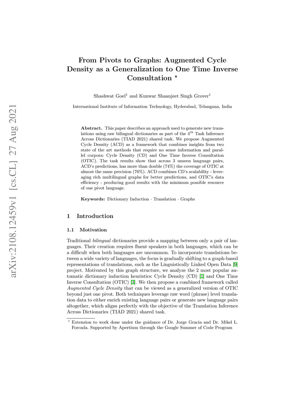 This paper describes an approach used to generate new translations using raw bilingual dictionaries as part of the 4th Task Inference Across Dictionaries (TIAD 2021) shared task. We propose Augmented Cycle Density (ACD) as a framework that combines insights from two state of the art methods that require no sense information and parallel corpora: Cycle Density (CD) and One Time Inverse Consultation (OTIC). The task results show that across 3 unseen language pairs, ACD's predictions, has more than double (74%) the coverage of OTIC at almost the same precision (76%). ACD combines CD's scalability - leveraging rich multilingual graphs for better predictions, and OTIC's data efficiency - producing good results with the minimum possible resource of one pivot language.
