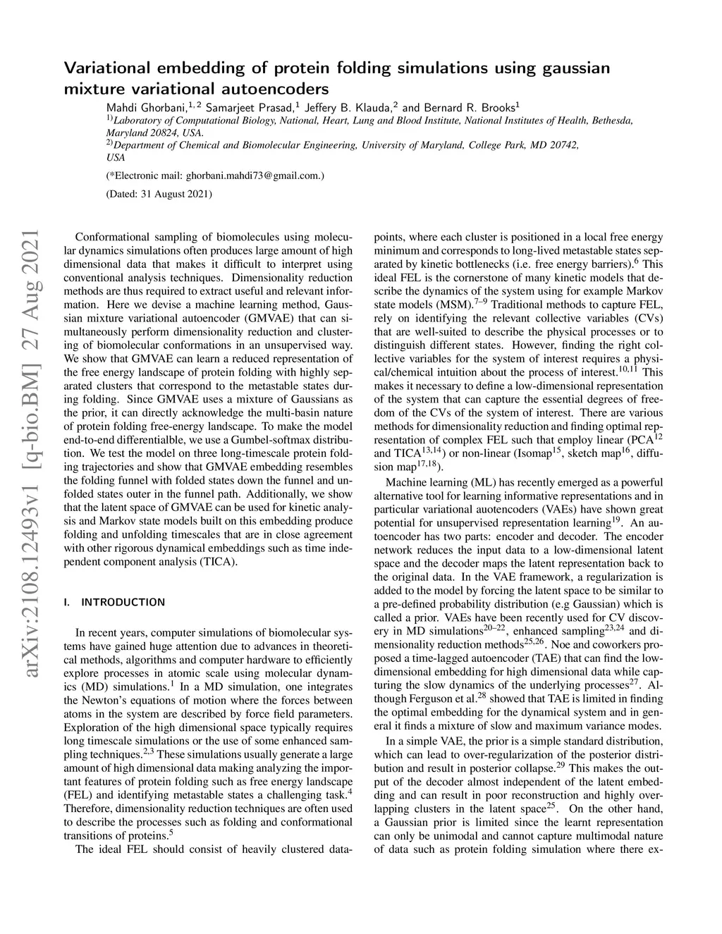 Conformational sampling of biomolecules using molecular dynamics simulations often produces large amount of high dimensional data that makes it difficult to interpret using conventional analysis techniques. Dimensionality reduction methods are thus required to extract useful and relevant information. Here we devise a machine learning method, Gaussian mixture variational autoencoder (GMVAE) that can simultaneously perform dimensionality reduction and clustering of biomolecular conformations in an unsupervised way. We show that GMVAE can learn a reduced representation of the free energy landscape of protein folding with highly separated clusters that correspond to the metastable states during folding. Since GMVAE uses a mixture of Gaussians as the prior, it can directly acknowledge the multi-basin nature of protein folding free-energy landscape. To make the model end-to-end differentialble, we use a Gumbel-softmax distribution. We test the model on three long-timescale protein folding trajectories and show that GMVAE embedding resembles the folding funnel with folded states down the funnel and unfolded states outer in the funnel path. Additionally, we show that the latent space of GMVAE can be used for kinetic analysis and Markov state models built on this embedding produce folding and unfolding timescales that are in close agreement with other rigorous dynamical embeddings such as time independent component analysis (TICA).
