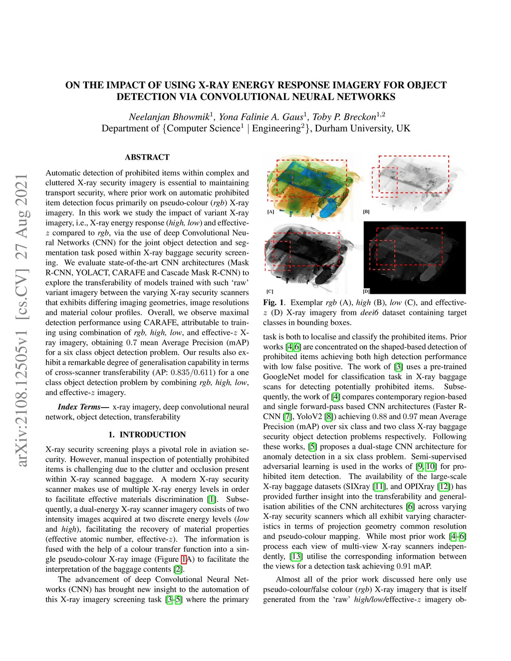 Automatic detection of prohibited items within complex and cluttered X-ray security imagery is essential to maintaining transport security, where prior work on automatic prohibited item detection focus primarily on pseudo-colour (rgb}) X-ray imagery. In this work we study the impact of variant X-ray imagery, i.e., X-ray energy response (high, low}) and effective-z compared to rgb, via the use of deep Convolutional Neural Networks (CNN) for the joint object detection and segmentation task posed within X-ray baggage security screening. We evaluate state-of-the-art CNN architectures (Mask R-CNN, YOLACT, CARAFE and Cascade Mask R-CNN) to explore the transferability of models trained with such 'raw' variant imagery between the varying X-ray security scanners that exhibits differing imaging geometries, image resolutions and material colour profiles. Overall, we observe maximal detection performance using CARAFE, attributable to training using combination of rgb, high, low, and effective-z X-ray imagery, obtaining 0.7 mean Average Precision (mAP) for a six class object detection problem. Our results also exhibit a remarkable degree of generalisation capability in terms of cross-scanner transferability (AP: 0.835/0.611) for a one class object detection problem by combining rgb, high, low, and effective-z imagery.