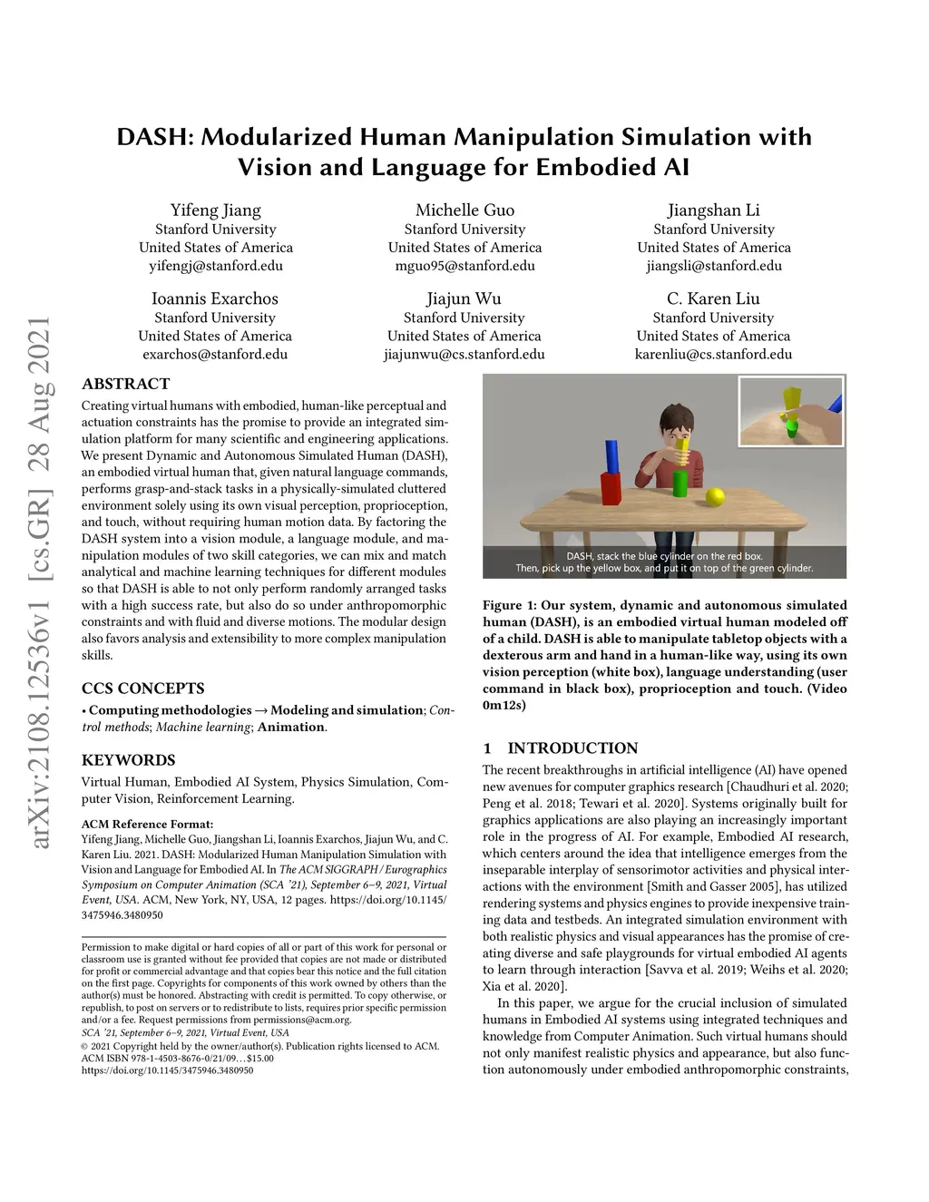 Creating virtual humans with embodied, human-like perceptual and actuation constraints has the promise to provide an integrated simulation platform for many scientific and engineering applications. We present Dynamic and Autonomous Simulated Human (DASH), an embodied virtual human that, given natural language commands, performs grasp-and-stack tasks in a physically-simulated cluttered environment solely using its own visual perception, proprioception, and touch, without requiring human motion data. By factoring the DASH system into a vision module, a language module, and manipulation modules of two skill categories, we can mix and match analytical and machine learning techniques for different modules so that DASH is able to not only perform randomly arranged tasks with a high success rate, but also do so under anthropomorphic constraints and with fluid and diverse motions. The modular design also favors analysis and extensibility to more complex manipulation skills.