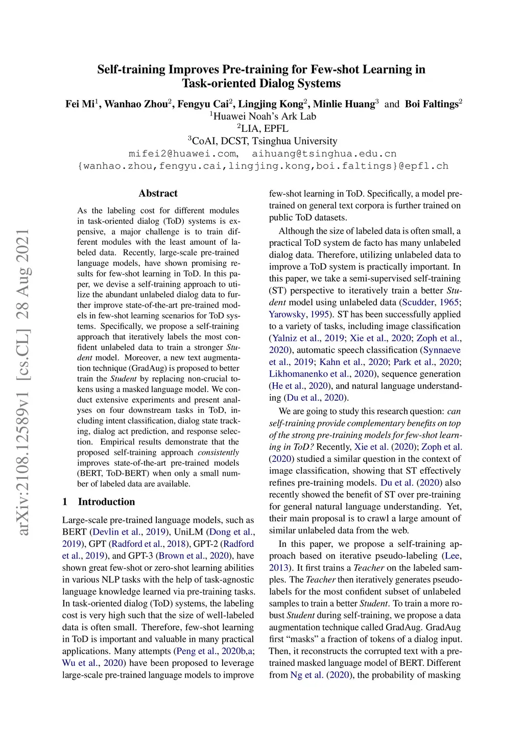 As the labeling cost for different modules in task-oriented dialog (ToD) systems is expensive, a major challenge is to train different modules with the least amount of labeled data. Recently, large-scale pre-trained language models, have shown promising results for few-shot learning in ToD. In this paper, we devise a self-training approach to utilize the abundant unlabeled dialog data to further improve state-of-the-art pre-trained models in few-shot learning scenarios for ToD systems. Specifically, we propose a self-training approach that iteratively labels the most confident unlabeled data to train a stronger Student model. Moreover, a new text augmentation technique (GradAug) is proposed to better train the Student by replacing non-crucial tokens using a masked language model. We conduct extensive experiments and present analyses on four downstream tasks in ToD, including intent classification, dialog state tracking, dialog act prediction, and response selection. Empirical results demonstrate that the proposed self-training approach consistently improves state-of-the-art pre-trained models (BERT, ToD-BERT) when only a small number of labeled data are available.