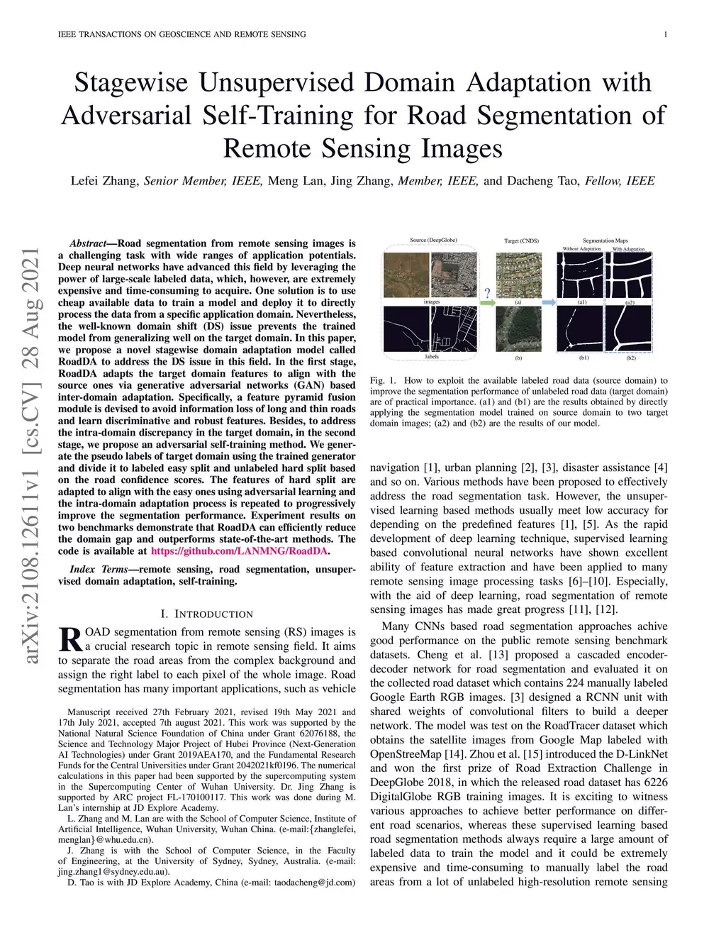 Road segmentation from remote sensing images is a challenging task with wide ranges of application potentials. Deep neural networks have advanced this field by leveraging the power of large-scale labeled data, which, however, are extremely expensive and time-consuming to acquire. One solution is to use cheap available data to train a model and deploy it to directly process the data from a specific application domain. Nevertheless, the well-known domain shift (DS) issue prevents the trained model from generalizing well on the target domain. In this paper, we propose a novel stagewise domain adaptation model called RoadDA to address the DS issue in this field. In the first stage, RoadDA adapts the target domain features to align with the source ones via generative adversarial networks (GAN) based inter-domain adaptation. Specifically, a feature pyramid fusion module is devised to avoid information loss of long and thin roads and learn discriminative and robust features. Besides, to address the intra-domain discrepancy in the target domain, in the second stage, we propose an adversarial self-training method. We generate the pseudo labels of target domain using the trained generator and divide it to labeled easy split and unlabeled hard split based on the road confidence scores. The features of hard split are adapted to align with the easy ones using adversarial learning and the intra-domain adaptation process is repeated to progressively improve the segmentation performance. Experiment results on two benchmarks demonstrate that RoadDA can efficiently reduce the domain gap and outperforms state-of-the-art methods.