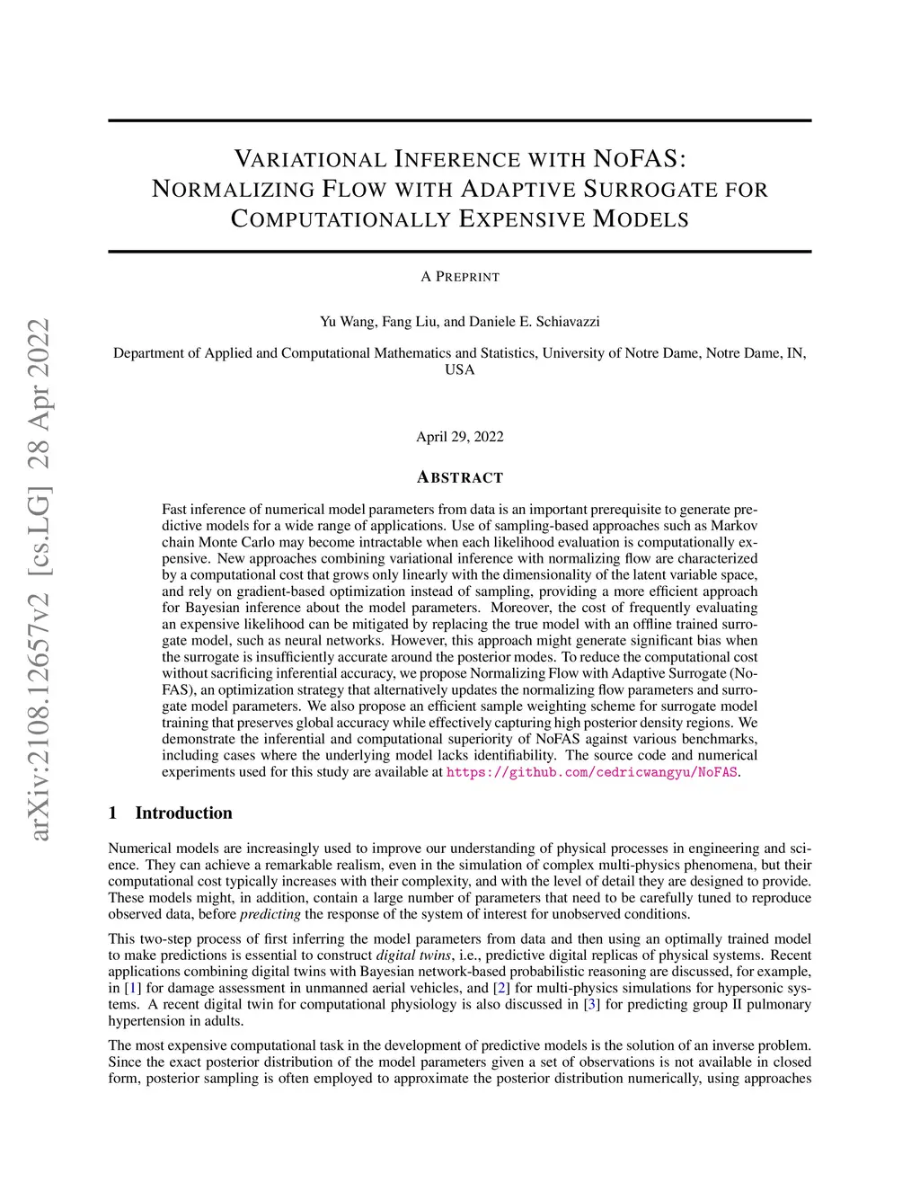 Fast inference of numerical model parameters from data is an important prerequisite to generate predictive models for a wide range of applications. Use of sampling-based approaches such as Markov chain Monte Carlo may become intractable when each likelihood evaluation is computationally expensive. New approaches combining variational inference with normalizing flow are characterized by a computational cost that grows only linearly with the dimensionality of the latent variable space, and rely on gradient-based optimization instead of sampling, providing a more efficient approach for Bayesian inference about the model parameters. Moreover, the cost of frequently evaluating an expensive likelihood can be mitigated by replacing the true model with an offline trained surrogate model, such as neural networks. However, this approach might generate significant bias when the surrogate is insufficiently accurate around the posterior modes. To reduce the computational cost without sacrificing inferential accuracy, we propose Normalizing Flow with Adaptive Surrogate (NoFAS), an optimization strategy that alternatively updates the normalizing flow parameters and surrogate model parameters. We also propose an efficient sample weighting scheme for surrogate model training that preserves global accuracy while effectively capturing high posterior density regions. We demonstrate the inferential and computational superiority of NoFAS against various benchmarks, including cases where the underlying model lacks identifiability. The source code and numerical experiments used for this study are available at https://github.com/cedricwangyu/NoFAS.