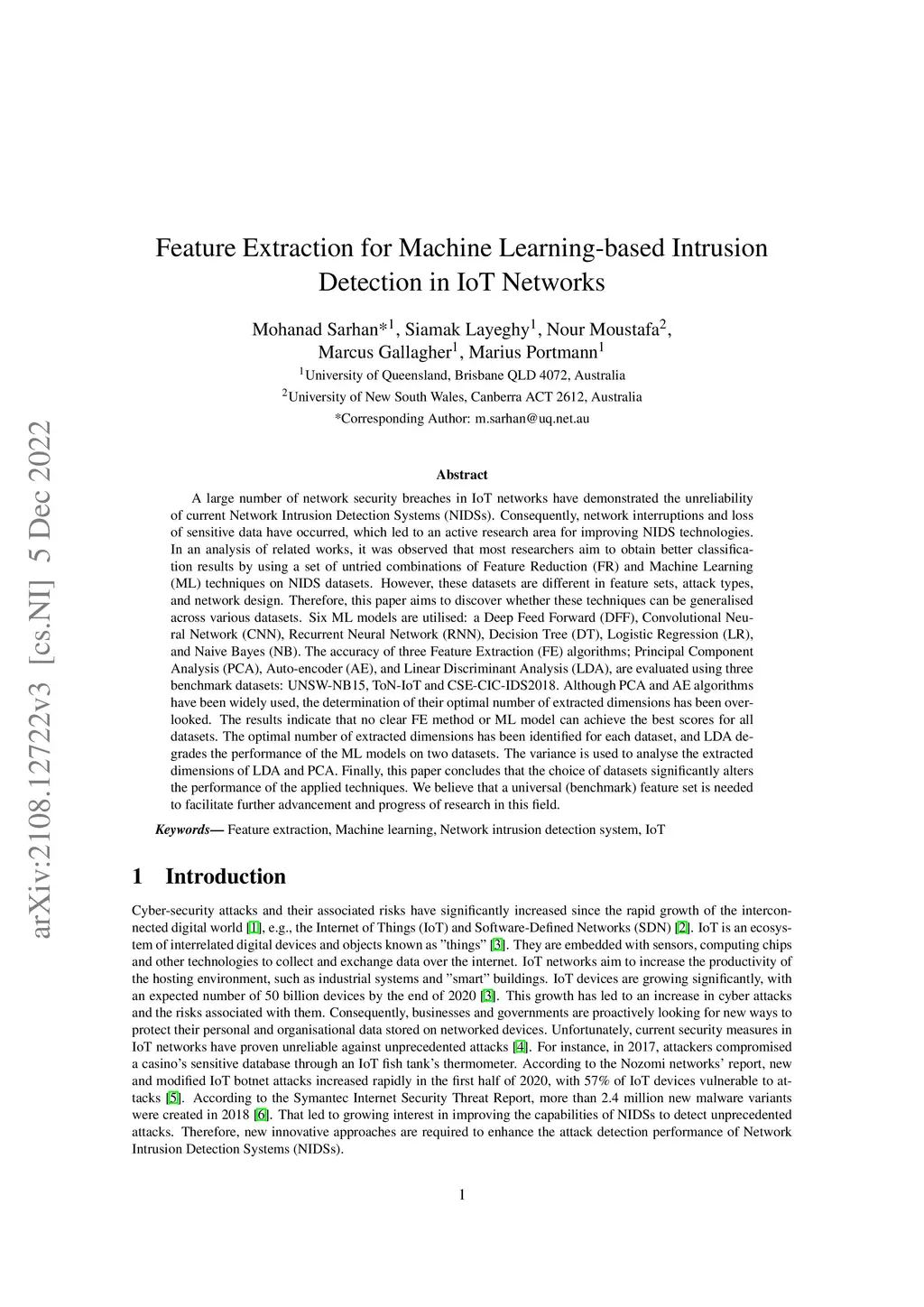 A large number of network security breaches in IoT networks have demonstrated the unreliability of current Network Intrusion Detection Systems (NIDSs). Consequently, network interruptions and loss of sensitive data have occurred, which led to an active research area for improving NIDS technologies. In an analysis of related works, it was observed that most researchers aim to obtain better classification results by using a set of untried combinations of Feature Reduction (FR) and Machine Learning (ML) techniques on NIDS datasets. However, these datasets are different in feature sets, attack types, and network design. Therefore, this paper aims to discover whether these techniques can be generalised across various datasets. Six ML models are utilised: a Deep Feed Forward (DFF), Convolutional Neural Network (CNN), Recurrent Neural Network (RNN), Decision Tree (DT), Logistic Regression (LR), and Naive Bayes (NB). The accuracy of three Feature Extraction (FE) algorithms; Principal Component Analysis (PCA), Auto-encoder (AE), and Linear Discriminant Analysis (LDA), are evaluated using three benchmark datasets: UNSW-NB15, ToN-IoT and CSE-CIC-IDS2018. Although PCA and AE algorithms have been widely used, the determination of their optimal number of extracted dimensions has been overlooked. The results indicate that no clear FE method or ML model can achieve the best scores for all datasets. The optimal number of extracted dimensions has been identified for each dataset, and LDA degrades the performance of the ML models on two datasets. The variance is used to analyse the extracted dimensions of LDA and PCA. Finally, this paper concludes that the choice of datasets significantly alters the performance of the applied techniques. We believe that a universal (benchmark) feature set is needed to facilitate further advancement and progress of research in this field.