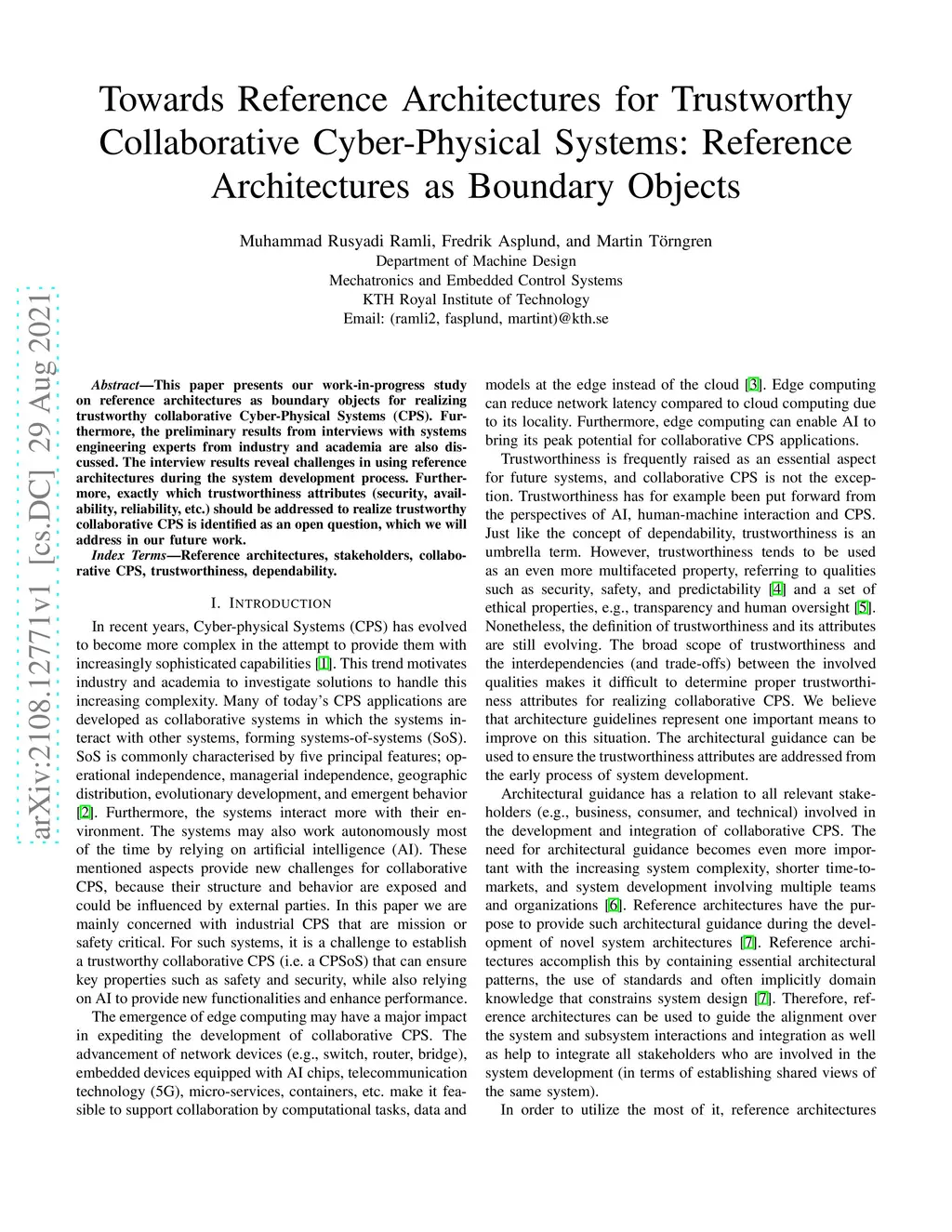 This paper presents our work-in-progress study on reference architectures as boundary objects for realizing trustworthy collaborative Cyber-Physical Systems (CPS). Furthermore, the preliminary results from interviews with systems engineering experts from industry and academia are also discussed. The interview results reveal challenges in using reference architectures during the system development process. Furthermore, exactly which trustworthiness attributes (security, availability, reliability, etc.) should be addressed to realize trustworthy collaborative CPS is identified as an open question, which we will address in our future work.