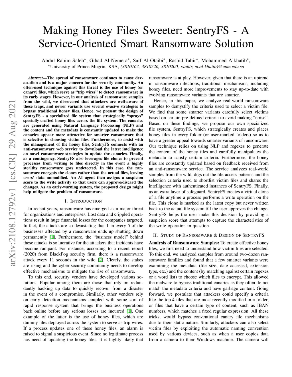 The spread of ransomware continues to cause devastation and is a major concern for the security community. An often-used technique against this threat is the use of honey (or canary) files, which serve as ``trip wires'' to detect ransomware in its early stages. However, in our analysis of ransomware samples from the wild, we discovered that attackers are well-aware of these traps, and newer variants use several evasive strategies to bypass traditional honey files. Hence, we present the design of SentryFS - a specialized file system that strategically ``sprays'' specially-crafted honey files across the file system. The canaries are generated using Natural Language Processing (NLP) and the content and the metadata is constantly updated to make the canaries appear more attractive for smarter ransomware that is selective in choosing victim files. Furthermore, to assist with the management of the honey files, SentryFS connects with an anti-ransomware web service to download the latest intelligence on novel ransomware strategies to update the canaries. Finally, as a contingency, SentryFS also leverages file clones to prevent processes from writing to files directly in the event a highly stealthy ransomware goes undetected. In this case, the ransomware encrypts the clones rather than the actual files, leaving users' data unmodified. An AI agent then assigns a suspicion score to the write activity so that users can approve/discard the changes. As an early-warning system, the proposed design might help mitigate the problem of ransomware.
