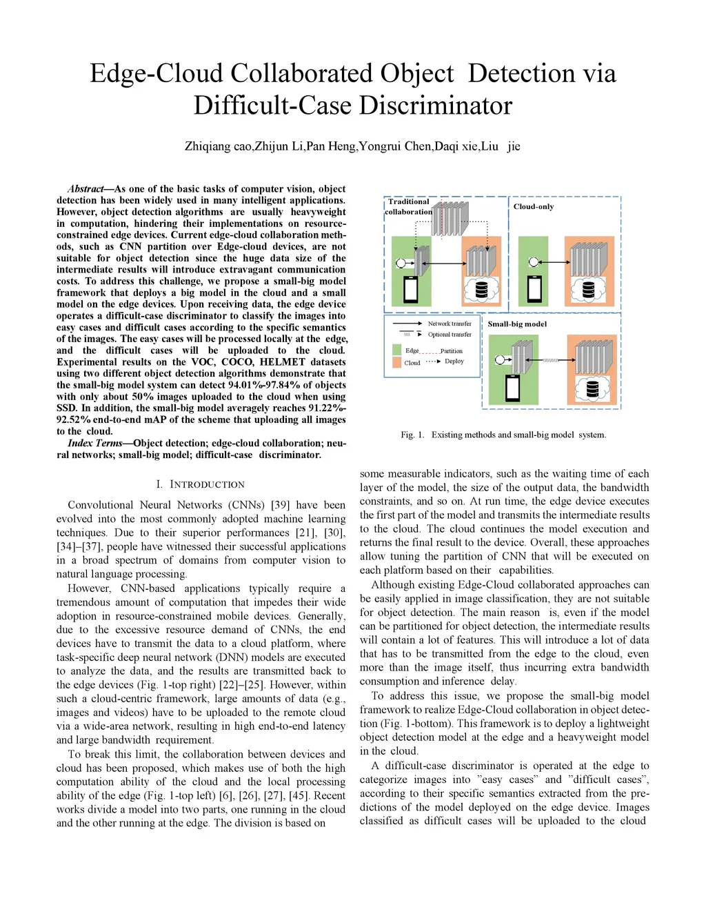 As one of the basic tasks of computer vision, object detection has been widely used in many intelligent applications. However, object detection algorithms are usually heavyweight in computation, hindering their implementations on resource-constrained edge devices. Current edge-cloud collaboration methods, such as CNN partition over Edge-cloud devices, are not suitable for object detection since the huge data size of the intermediate results will introduce extravagant communication costs. To address this challenge, we propose a small-big model framework that deploys a big model in the cloud and a small model on the edge devices. Upon receiving data, the edge device operates a difficult-case discriminator to classify the images into easy cases and difficult cases according to the specific semantics of the images. The easy cases will be processed locally at the edge, and the difficult cases will be uploaded to the cloud. Experimental results on the VOC, COCO, HELMET datasets using two different object detection algorithms demonstrate that the small-big model system can detect 94.01%-97.84% of objects with only about 50% images uploaded to the cloud when using SSD. In addition, the small-big model averagely reaches 91.22%- 92.52% end-to-end mAP of the scheme that uploading all images to the cloud.