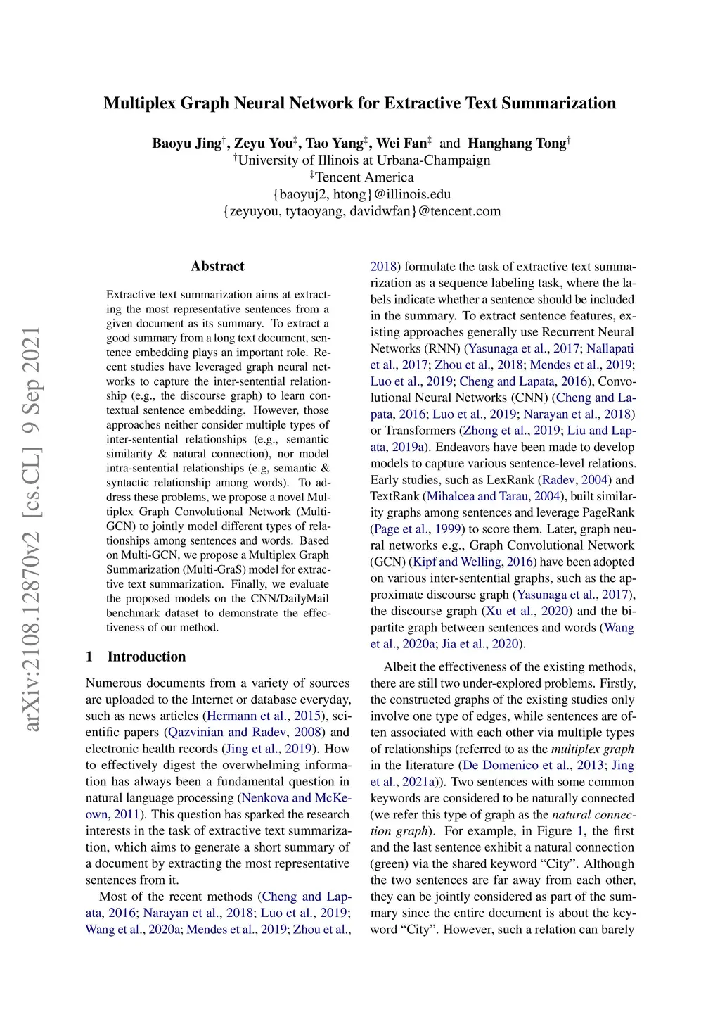 Multiplex Graph Neural Network for Extractive Text Summarization