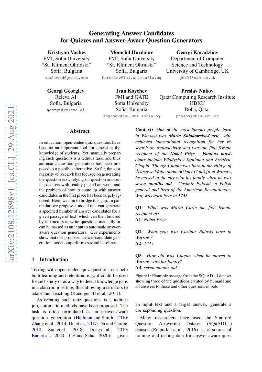 Generating Answer Candidates for Quizzes and Answer-Aware Question