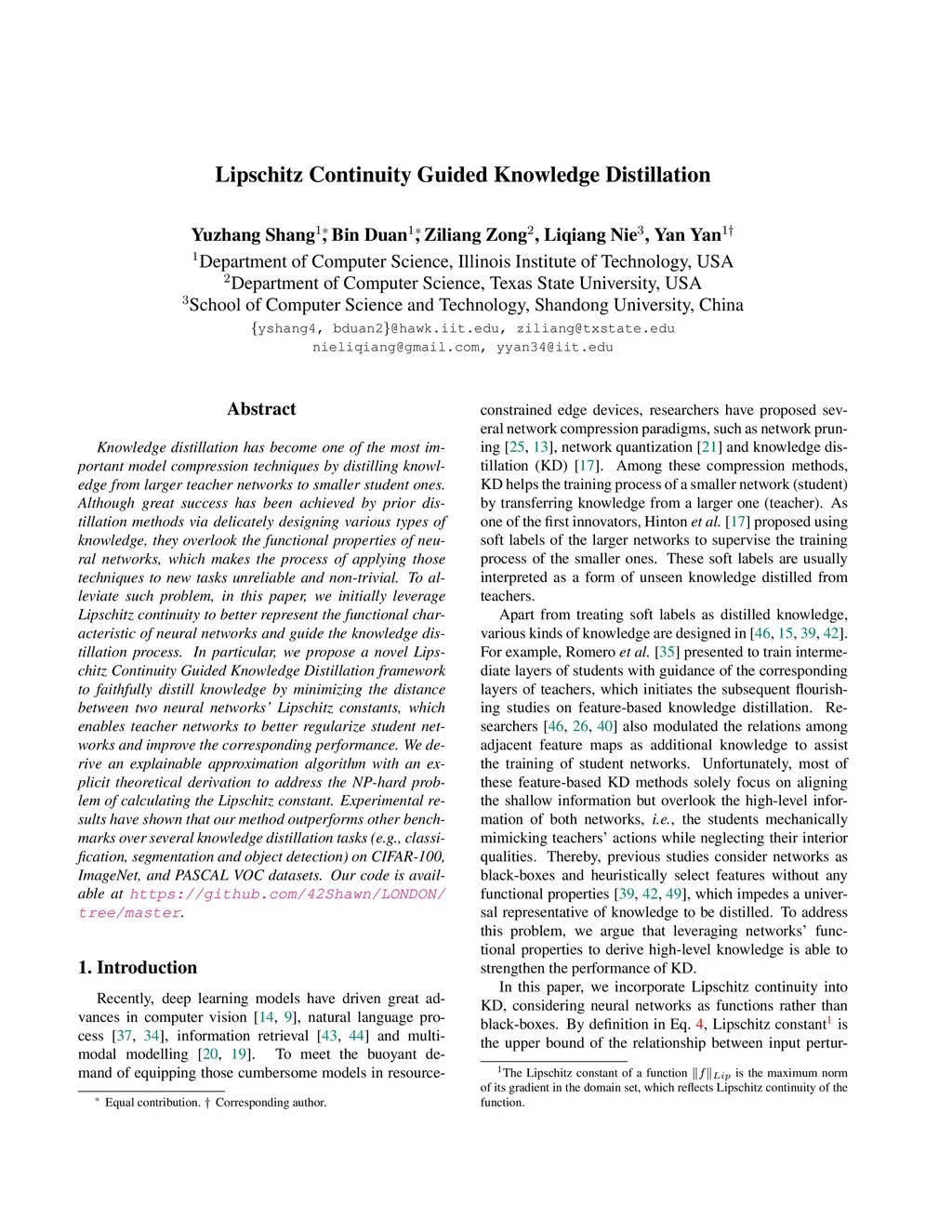 Knowledge distillation has become one of the most important model compression techniques by distilling knowledge from larger teacher networks to smaller student ones. Although great success has been achieved by prior distillation methods via delicately designing various types of knowledge, they overlook the functional properties of neural networks, which makes the process of applying those techniques to new tasks unreliable and non-trivial. To alleviate such problem, in this paper, we initially leverage Lipschitz continuity to better represent the functional characteristic of neural networks and guide the knowledge distillation process. In particular, we propose a novel Lipschitz Continuity Guided Knowledge Distillation framework to faithfully distill knowledge by minimizing the distance between two neural networks' Lipschitz constants, which enables teacher networks to better regularize student networks and improve the corresponding performance. We derive an explainable approximation algorithm with an explicit theoretical derivation to address the NP-hard problem of calculating the Lipschitz constant. Experimental results have shown that our method outperforms other benchmarks over several knowledge distillation tasks (e.g., classification, segmentation and object detection) on CIFAR-100, ImageNet, and PASCAL VOC datasets.