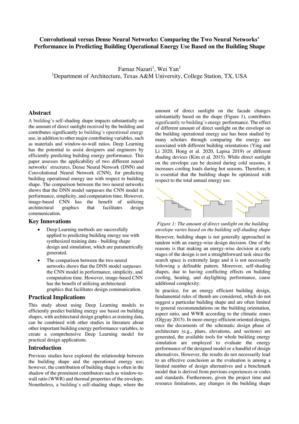 A building self-shading shape impacts substantially on the amount of direct sunlight received by the building and contributes significantly to building operational energy use, in addition to other major contributing variables, such as materials and window-to-wall ratios. Deep Learning has the potential to assist designers and engineers by efficiently predicting building energy performance. This paper assesses the applicability of two different neural networks structures, Dense Neural Network (DNN) and Convolutional Neural Network (CNN), for predicting building operational energy use with respect to building shape. The comparison between the two neural networks shows that the DNN model surpasses the CNN model in performance, simplicity, and computation time. However, image-based CNN has the benefit of utilizing architectural graphics that facilitates design communication.