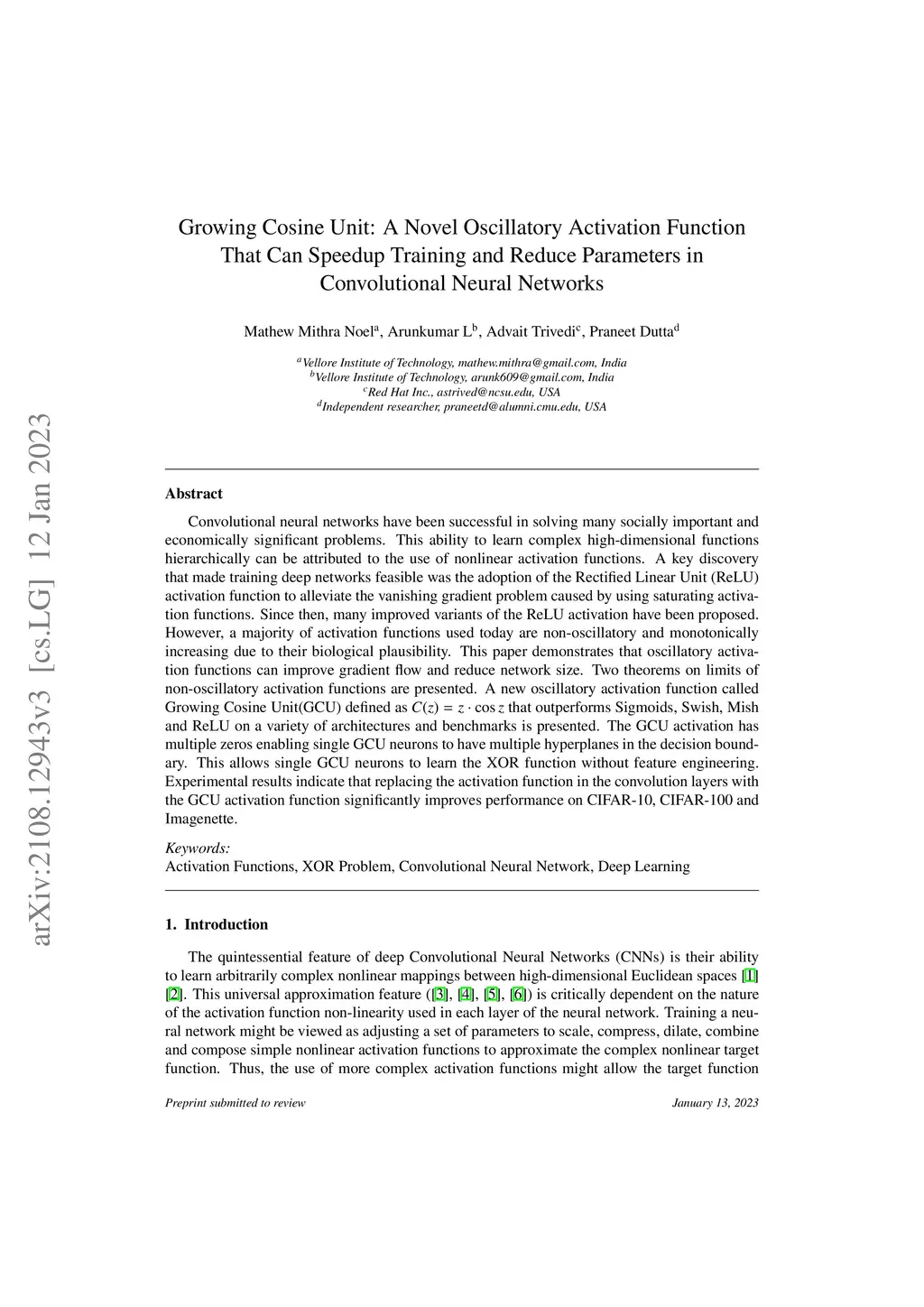 Growing Cosine Unit: A Novel Oscillatory Activation Function That Can