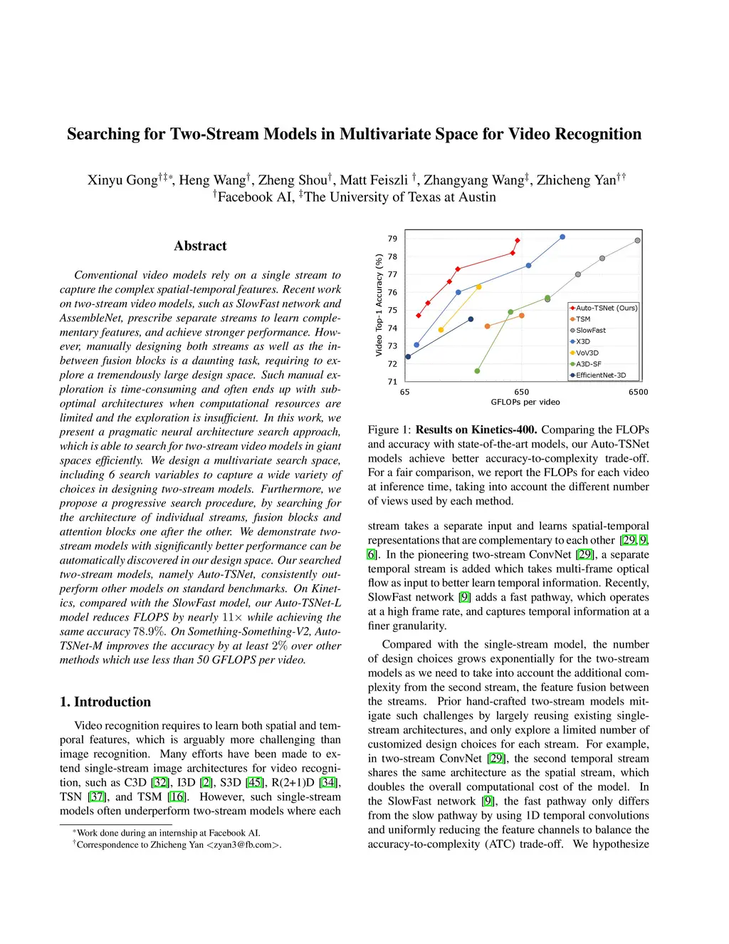 Conventional video models rely on a single stream to capture the complex spatial-temporal features. Recent work on two-stream video models, such as SlowFast network and AssembleNet, prescribe separate streams to learn complementary features, and achieve stronger performance. However, manually designing both streams as well as the in-between fusion blocks is a daunting task, requiring to explore a tremendously large design space. Such manual exploration is time-consuming and often ends up with sub-optimal architectures when computational resources are limited and the exploration is insufficient. In this work, we present a pragmatic neural architecture search approach, which is able to search for two-stream video models in giant spaces efficiently. We design a multivariate search space, including 6 search variables to capture a wide variety of choices in designing two-stream models. Furthermore, we propose a progressive search procedure, by searching for the architecture of individual streams, fusion blocks, and attention blocks one after the other. We demonstrate two-stream models with significantly better performance can be automatically discovered in our design space. Our searched two-stream models, namely Auto-TSNet, consistently outperform other models on standard benchmarks. On Kinetics, compared with the SlowFast model, our Auto-TSNet-L model reduces FLOPS by nearly 11 times while achieving the same accuracy 78.9%. On Something-Something-V2, Auto-TSNet-M improves the accuracy by at least 2% over other methods which use less than 50 GFLOPS per video.