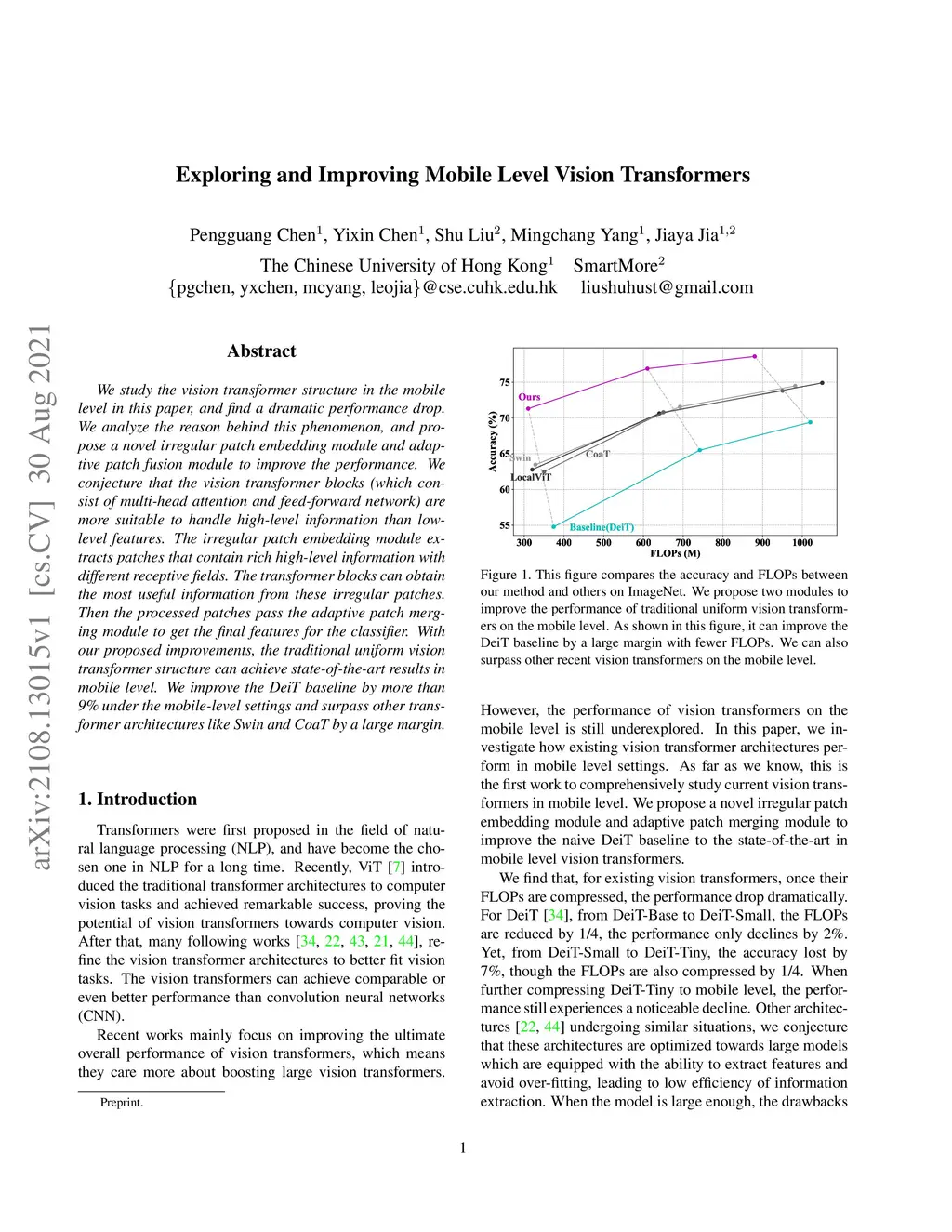 We study the vision transformer structure in the mobile level in this paper, and find a dramatic performance drop. We analyze the reason behind this phenomenon, and propose a novel irregular patch embedding module and adaptive patch fusion module to improve the performance. We conjecture that the vision transformer blocks (which consist of multi-head attention and feed-forward network) are more suitable to handle high-level information than low-level features. The irregular patch embedding module extracts patches that contain rich high-level information with different receptive fields. The transformer blocks can obtain the most useful information from these irregular patches. Then the processed patches pass the adaptive patch merging module to get the final features for the classifier. With our proposed improvements, the traditional uniform vision transformer structure can achieve state-of-the-art results in mobile level. We improve the DeiT baseline by more than 9\% under the mobile-level settings and surpass other transformer architectures like Swin and CoaT by a large margin.