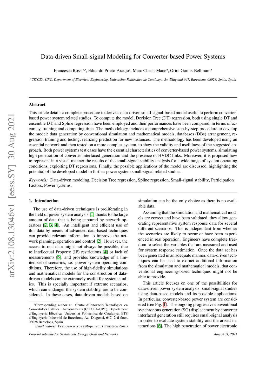 This article details a complete procedure to derive a data-driven small-signal-based model useful to perform converter-based power system related studies. To compute the model, Decision Tree (DT) regression, both using single DT and ensemble DT, and Spline regression have been employed and their performances have been compared, in terms of accuracy, training and computing time. The methodology includes a comprehensive step-by-step procedure to develop the model: data generation by conventional simulation and mathematical models, databases (DBs) arrangement, regression training and testing, realizing prediction for new instances. The methodology has been developed using an essential network and then tested on a more complex system, to show the validity and usefulness of the suggested approach. Both power systems test cases have the essential characteristics of converter-based power systems, simulating high penetration of converter interfaced generation and the presence of HVDC links. Moreover, it is proposed how to represent in a visual manner the results of the small-signal stability analysis for a wide range of system operating conditions, exploiting DT regressions. Finally, the possible applications of the model are discussed, highlighting the potential of the developed model in further power system small-signal related studies.
