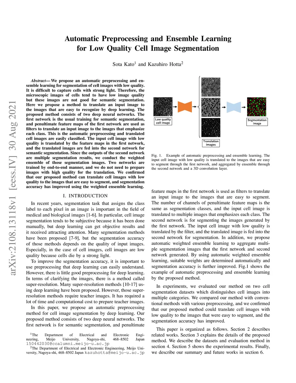 We propose an automatic preprocessing and ensemble learning for segmentation of cell images with low quality. It is difficult to capture cells with strong light. Therefore, the microscopic images of cells tend to have low image quality but these images are not good for semantic segmentation. Here we propose a method to translate an input image to the images that are easy to recognize by deep learning. The proposed method consists of two deep neural networks. The first network is the usual training for semantic segmentation, and penultimate feature maps of the first network are used as filters to translate an input image to the images that emphasize each class. This is the automatic preprocessing and translated cell images are easily classified. The input cell image with low quality is translated by the feature maps in the first network, and the translated images are fed into the second network for semantic segmentation. Since the outputs of the second network are multiple segmentation results, we conduct the weighted ensemble of those segmentation images. Two networks are trained by end-to-end manner, and we do not need to prepare images with high quality for the translation. We confirmed that our proposed method can translate cell images with low quality to the images that are easy to segment, and segmentation accuracy has improved using the weighted ensemble learning.