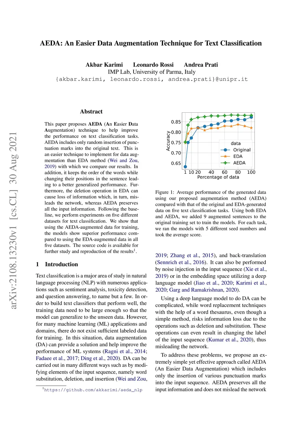 This paper proposes AEDA (An Easier Data Augmentation) technique to help improve the performance on text classification tasks. AEDA includes only random insertion of punctuation marks into the original text. This is an easier technique to implement for data augmentation than EDA method (Wei and Zou, 2019) with which we compare our results. In addition, it keeps the order of the words while changing their positions in the sentence leading to a better generalized performance. Furthermore, the deletion operation in EDA can cause loss of information which, in turn, misleads the network, whereas AEDA preserves all the input information. Following the baseline, we perform experiments on five different datasets for text classification. We show that using the AEDA-augmented data for training, the models show superior performance compared to using the EDA-augmented data in all five datasets. The source code is available for further study and reproduction of the results.