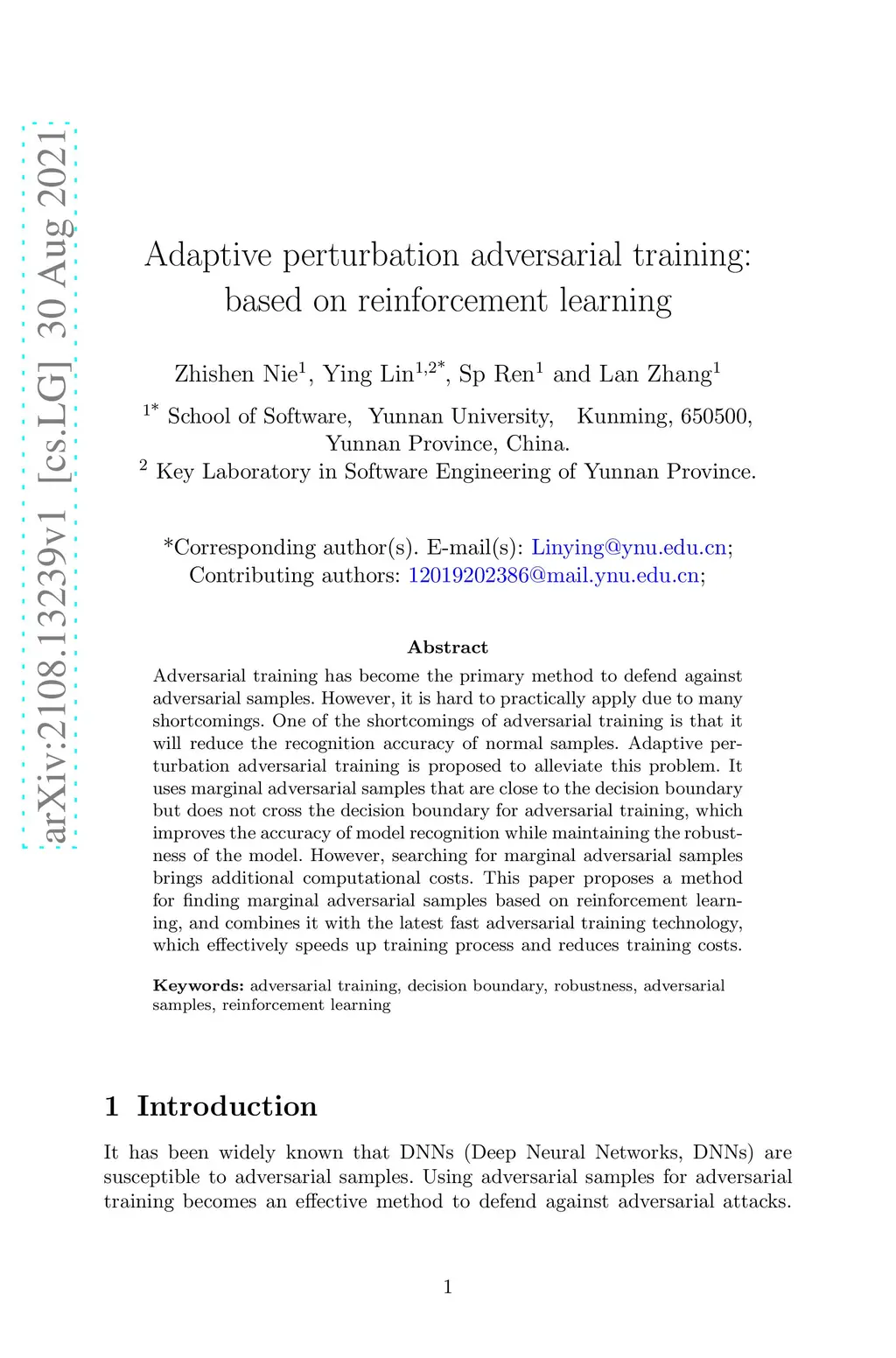 Adversarial training has become the primary method to defend against adversarial samples. However, it is hard to practically apply due to many shortcomings. One of the shortcomings of adversarial training is that it will reduce the recognition accuracy of normal samples. Adaptive perturbation adversarial training is proposed to alleviate this problem. It uses marginal adversarial samples that are close to the decision boundary but does not cross the decision boundary for adversarial training, which improves the accuracy of model recognition while maintaining the robustness of the model. However, searching for marginal adversarial samples brings additional computational costs. This paper proposes a method for finding marginal adversarial samples based on reinforcement learning, and combines it with the latest fast adversarial training technology, which effectively speeds up training process and reduces training costs.