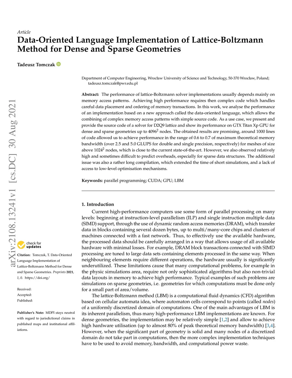 The performance of lattice-Boltzmann solver implementations usually depends mainly on memory access patterns. Achieving high performance requires then complex code which handles careful data placement and ordering of memory transactions. In this work, we analyse the performance of an implementation based on a new approach called the data-oriented language, which allows the combining of complex memory access patterns with simple source code. As a use case, we present and provide the source code of a solver for D2Q9 lattice and show its performance on GTX Titan Xp GPU for dense and sparse geometries up to 4096 2 nodes. The obtained results are promising, around 1000 lines of code allowed us to achieve performance in the range of 0.6 to 0.7 of maximum theoretical memory bandwidth (over 2.5 and 5.0 GLUPS for double and single precision, respectively) for meshes of size above 1024 2 nodes, which is close to the current state-of-the-art. However, we also observed relatively high and sometimes difficult to predict overheads, especially for sparse data structures. The additional issue was also a rather long compilation, which extended the time of short simulations, and a lack of access to low-level optimisation mechanisms.