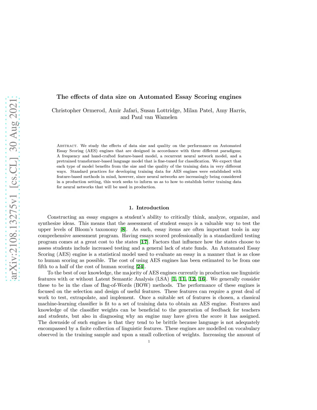 The effects of data size on Automated Essay Scoring engines