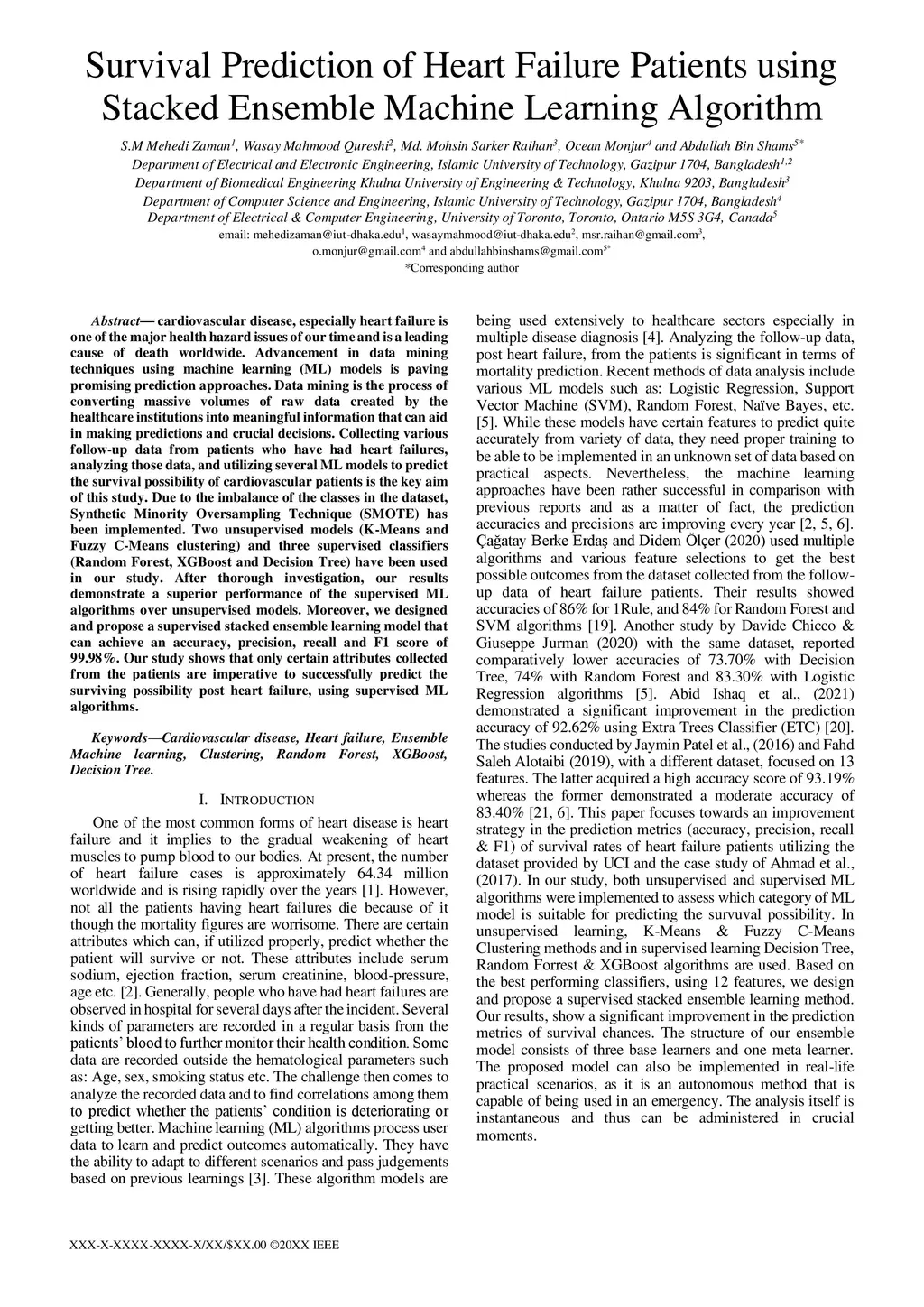 Survival Prediction of Heart Failure Patients using Stacked Ensemble