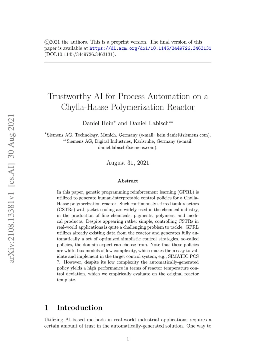 In this paper, genetic programming reinforcement learning (GPRL) is utilized to generate human-interpretable control policies for a Chylla-Haase polymerization reactor. Such continuously stirred tank reactors (CSTRs) with jacket cooling are widely used in the chemical industry, in the production of fine chemicals, pigments, polymers, and medical products. Despite appearing rather simple, controlling CSTRs in real-world applications is quite a challenging problem to tackle. GPRL utilizes already existing data from the reactor and generates fully automatically a set of optimized simplistic control strategies, so-called policies, the domain expert can choose from. Note that these policies are white-box models of low complexity, which makes them easy to validate and implement in the target control system, e.g., SIMATIC PCS 7. However, despite its low complexity the automatically-generated policy yields a high performance in terms of reactor temperature control deviation, which we empirically evaluate on the original reactor template.