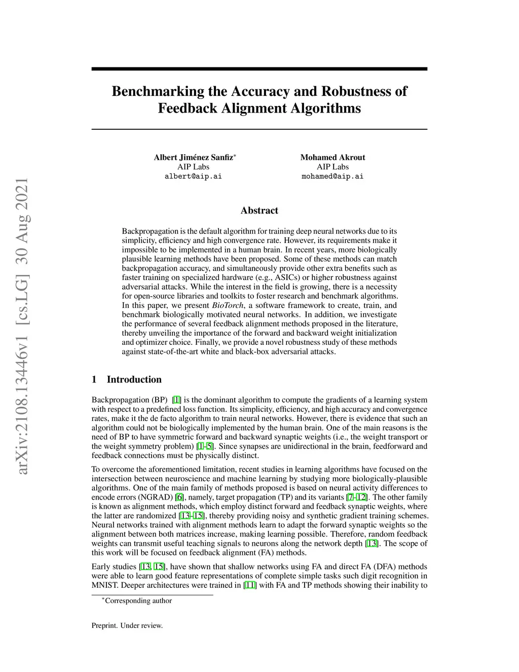 Backpropagation is the default algorithm for training deep neural networks due to its simplicity, efficiency and high convergence rate. However, its requirements make it impossible to be implemented in a human brain. In recent years, more biologically plausible learning methods have been proposed. Some of these methods can match backpropagation accuracy, and simultaneously provide other extra benefits such as faster training on specialized hardware (e.g., ASICs) or higher robustness against adversarial attacks. While the interest in the field is growing, there is a necessity for open-source libraries and toolkits to foster research and benchmark algorithms. In this paper, we present BioTorch, a software framework to create, train, and benchmark biologically motivated neural networks. In addition, we investigate the performance of several feedback alignment methods proposed in the literature, thereby unveiling the importance of the forward and backward weight initialization and optimizer choice. Finally, we provide a novel robustness study of these methods against state-of-the-art white and black-box adversarial attacks.
